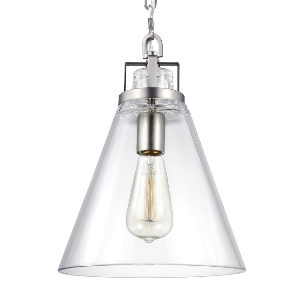The Sean Lavin Frontage, one light pendant in oil-rubbed bronze, is the perfect way to achieve your home's desired fashion or functional needs. The modern Frontage pendant light collection by Sean Lavin is an updated interpretation of a vintage warehouse fixture. In conical silhouettes, the hand-blown Opal Etched glass or Pressed Clear glass shades to create a dramatic contrast to the industrial frame detail which crowns each pendant. When Edison-style lamps are selected, they reinforce the vintage reference while giving the fixtures a dramatic and contemporary flair. These 1-light pendants are available with either Oil Rubbed Bronze or Satin Nickel finishes.