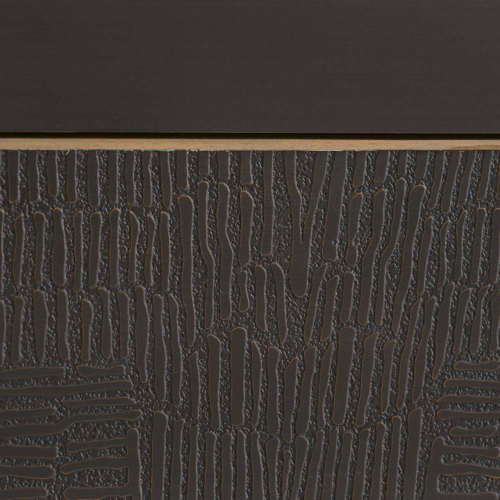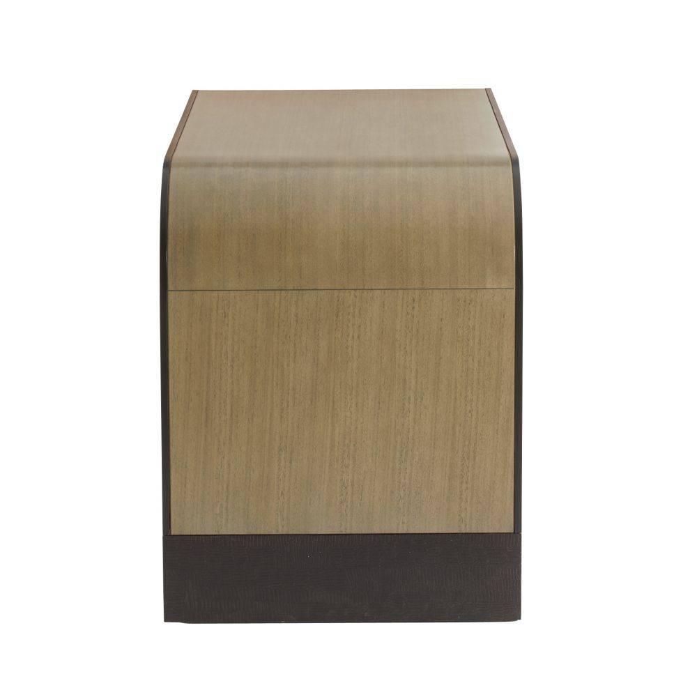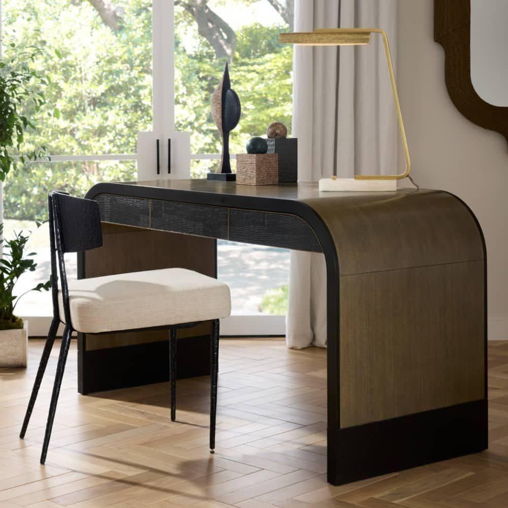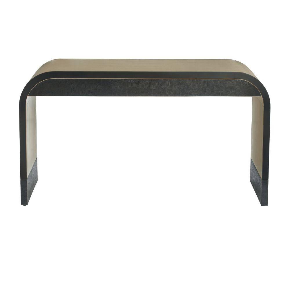 Art Deco-inspired, this waterfall desk of chamois gray eucalyptus veneer offers the ideal textural accent to any office space. Soft-close drawers with a bronze textured brass are outlined with antique brass exterior, as well as constructed from ebony oak veneer. Finish will vary.