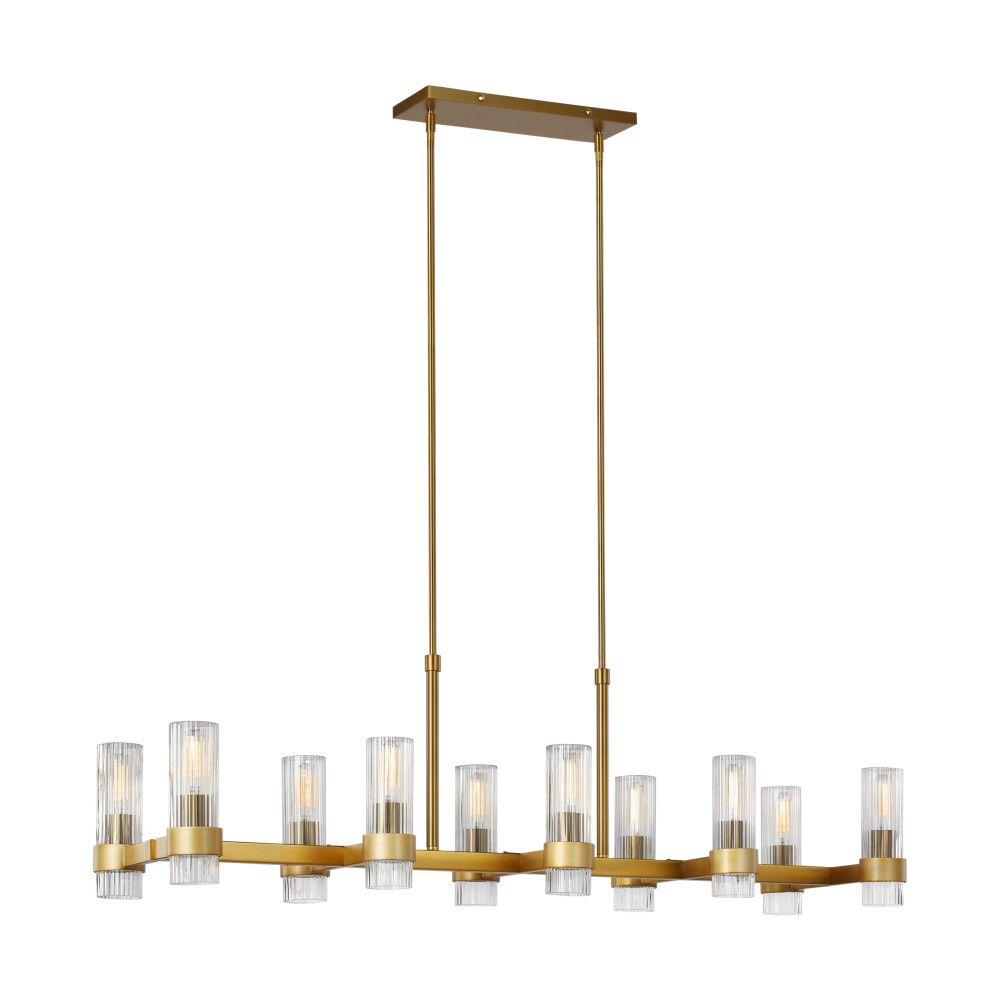 In the Geneva ten light billiard island chandelier, slender fluted shades form an elegant, dynamic silhouette that's balanced by a strong frame of Burnished Brass or Polished Nickel.