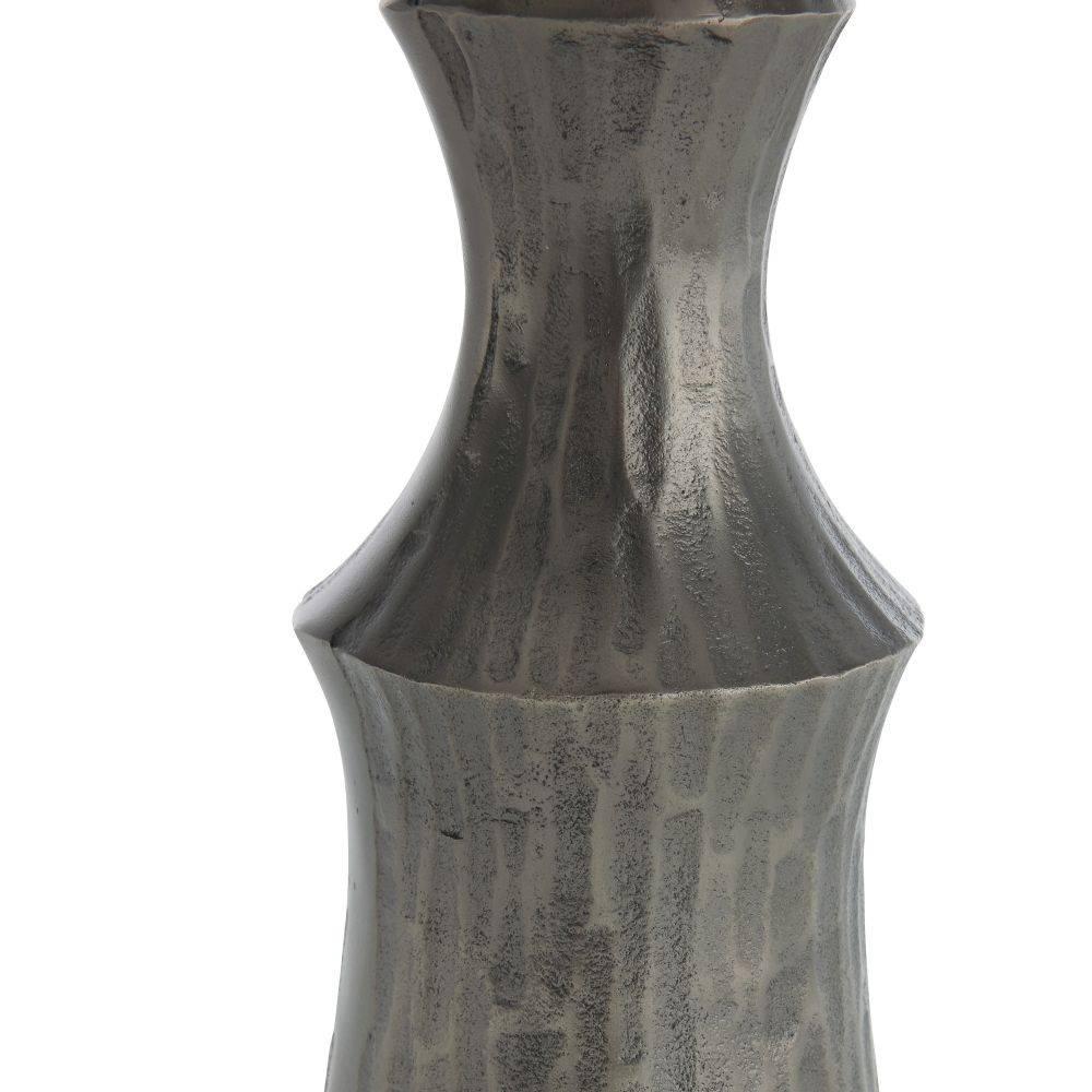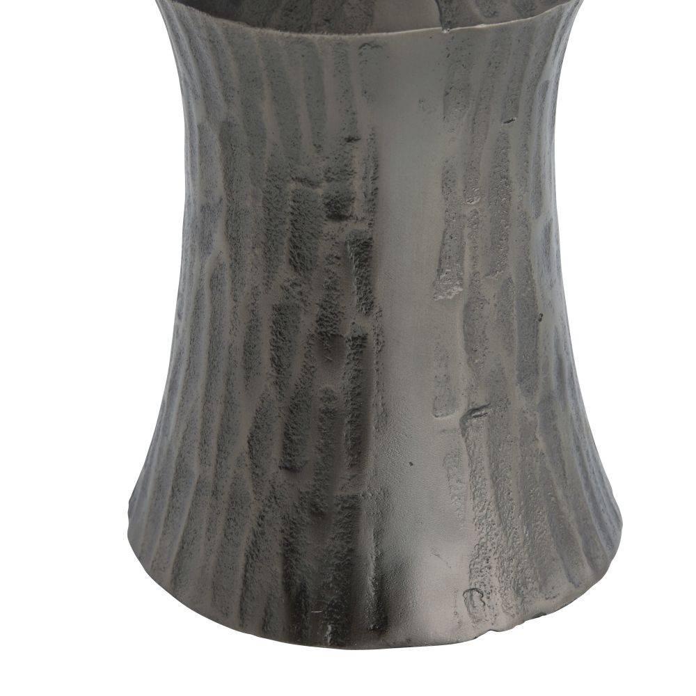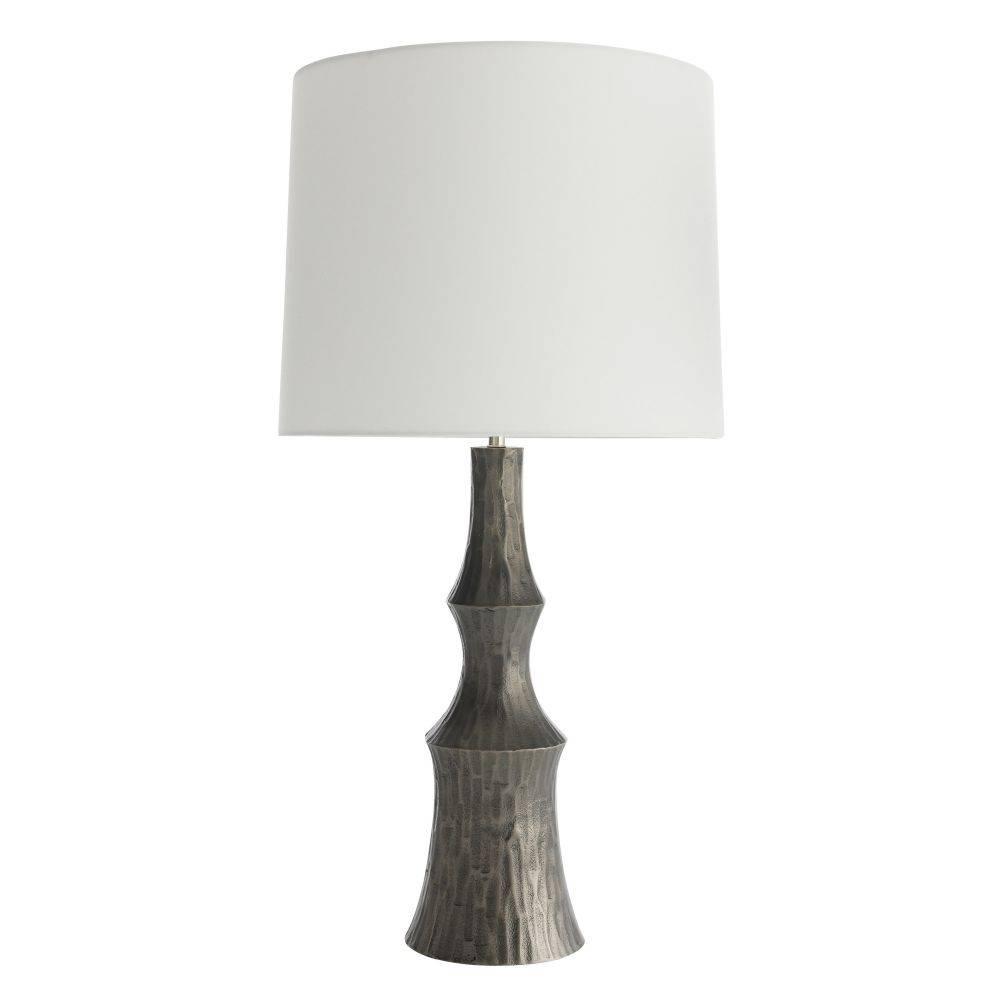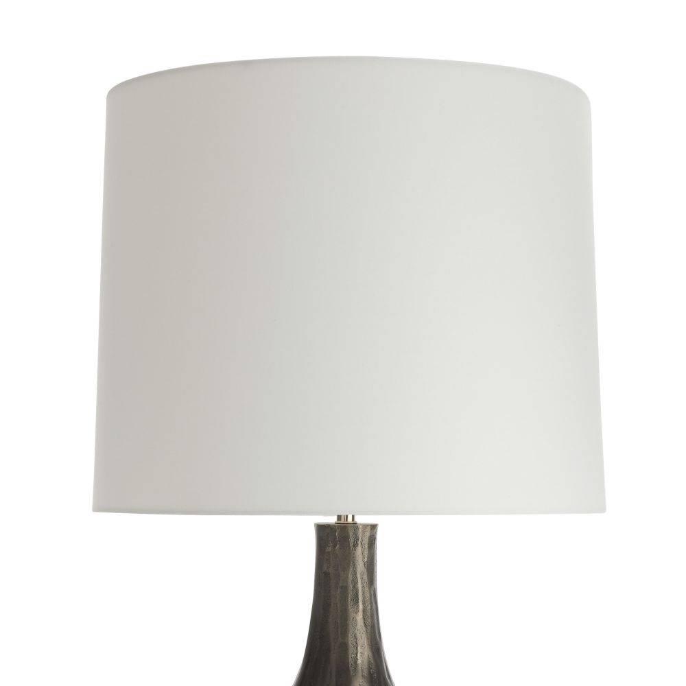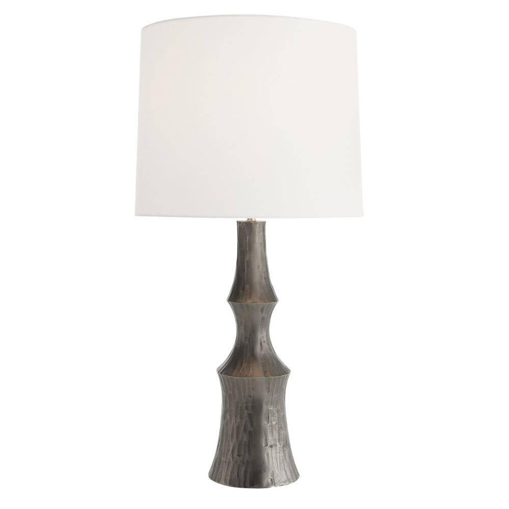 An iconic silhouette of cast-graphite aluminum is carved and seamed for textural interest. Appearing black at first sight, the tree-bark-inspired finish adds a visual depth that effortlessly draws the eye. Topped with an off-white cotton drum shade lined in off-white cotton and matching graphite finial.