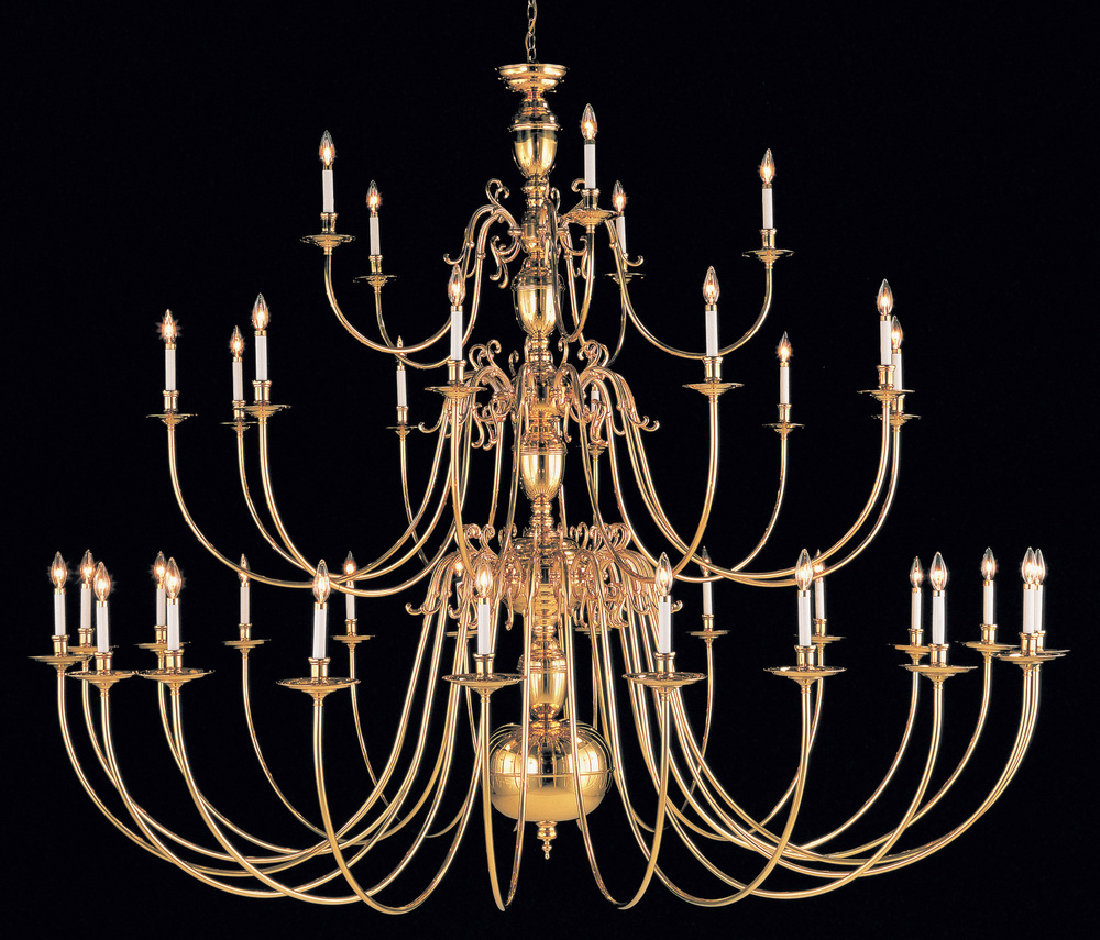 Hermitage 84"Wide x 84"Long x 60"High Lights: 35 x 40W candelabra Finish Shown: Polished Brass Crystal Shown: n/a Chain or Cable Length: 6 Ship Via: TRUCK Shipping Weight: 150 Hanging Weight: 102 Catalog/Page Ref: 5005/294 Classic’s Hermitage collection offers traditional Early American styling with heavy gauge arms and brass castings. This solid brass series is furnished in a wide variety of sizes and light configurations scaled for beautiful residences or commercial establishments