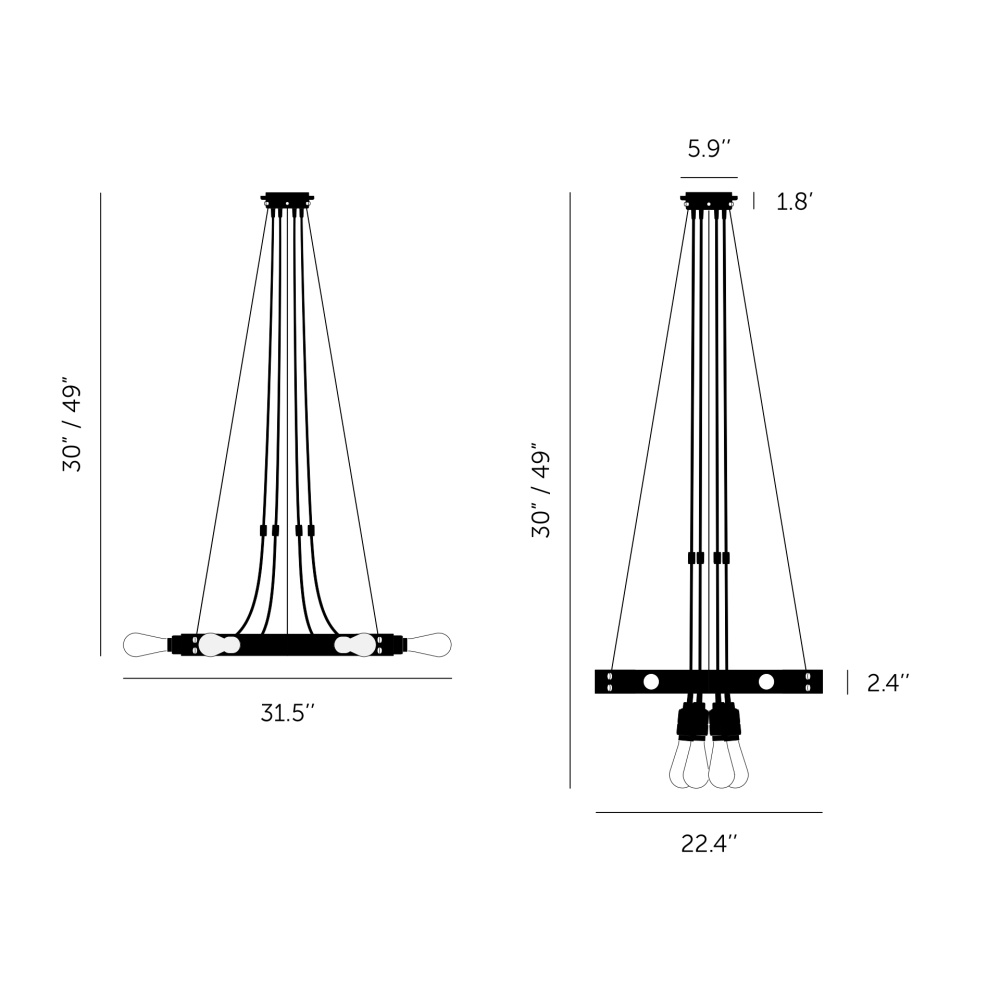 A chandelier finished in a graphite powder coat and features six pendants, with solid knurled metal and matt rubber detailing.