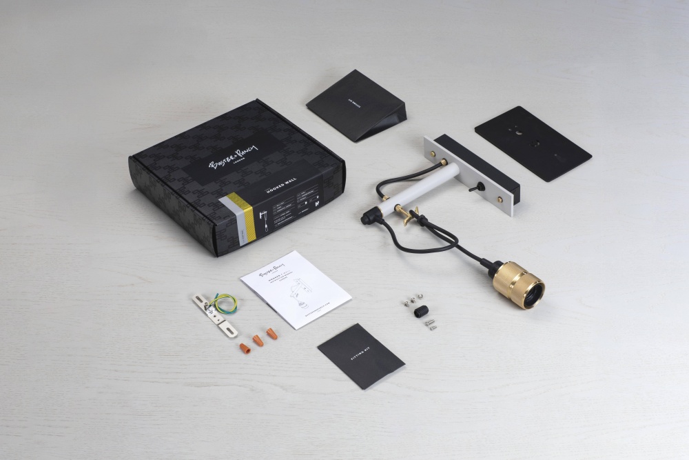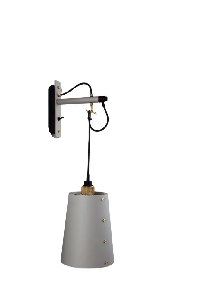 A wall light made from stone powder coated metal with solid brass detailing.