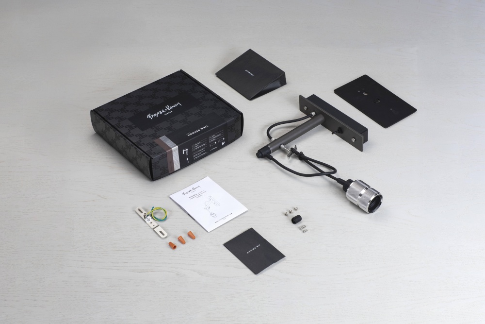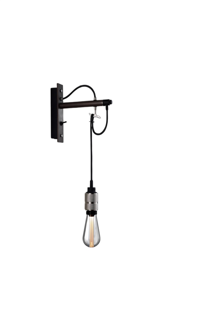 A wall light made from graphite powder coated metal with solid steel, brass or smoked bronze detailing.