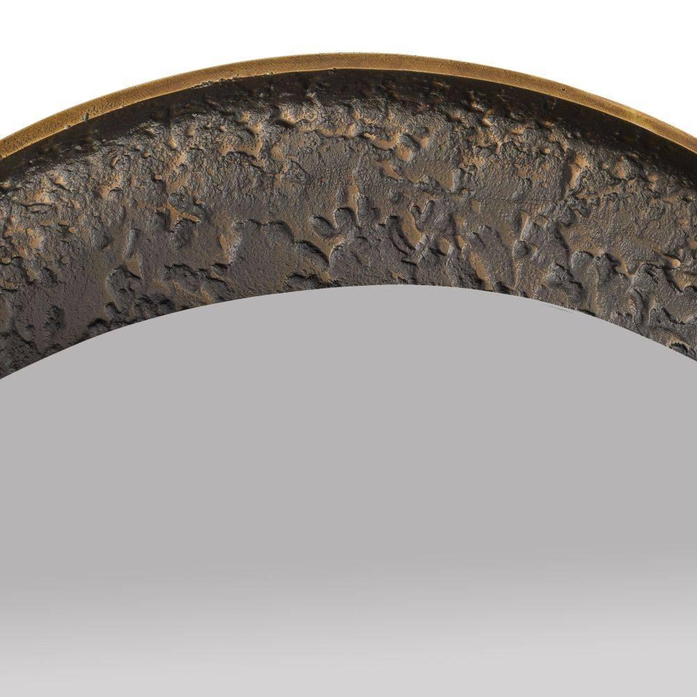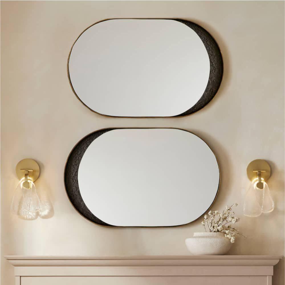 Playing with the concept of filled and unfilled forms, the Inset wall mirror's smooth glossy surface is set within a deeply textured, bronze-plated aluminum form as if it were being poured into a void. The offset, antique brass plated aluminum pill shaped elements create a sense of sliding motion, making the mirror a uniquely modern, dynamic choice for interiors of all kinds. The Inset mirror can be hung vertically or horizontally to create unique compositions. Finished with a cleat at the back for security. Finish will vary.