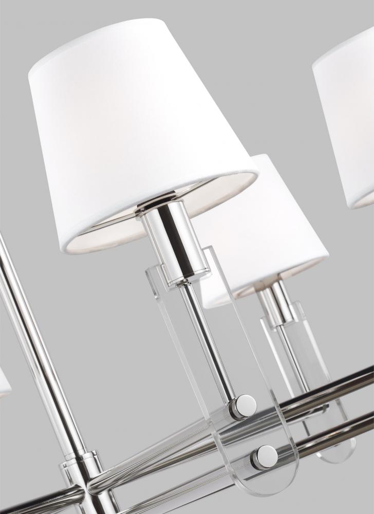 Jake features a Polished Nickel finish, white fabric shades and clear glass stems, adding a sleek element to this timeless design.