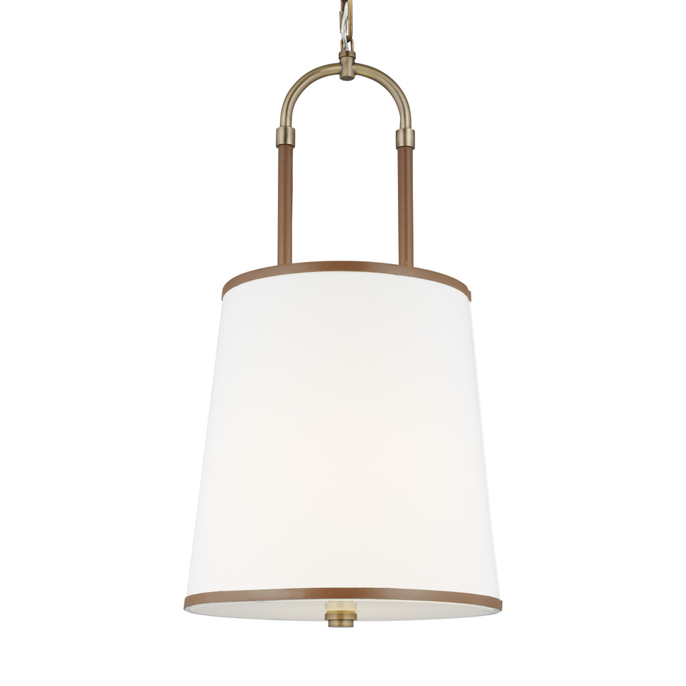 In the Katie one light shade pendant leather straps contrast with metal and white linen fabric shade to round out a timeless design. Available in: Time Worn Brass with Brown Leather or Polished Nickel with Black Leather. The combination of leather and steel gives this round chandelier equestrian flair.