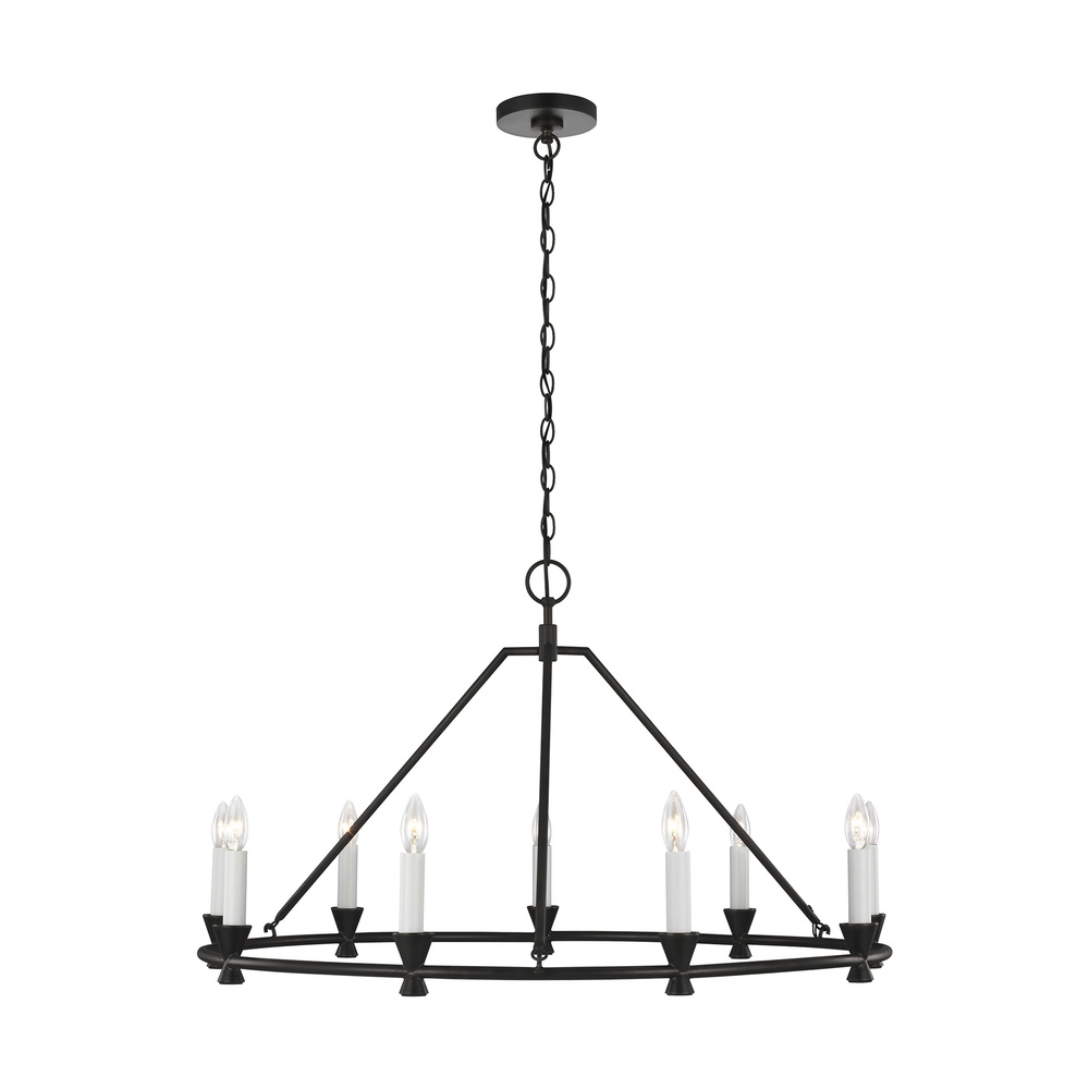 The Keystone nine light single tier chandelier highlights the popular wagon wheel silhouette. The exposed candelabra on an angular, Aged Iron frame ensures the Keystone family casts a warm and inviting glow. This series of chandeliers, sconces and pendants designed by Chapman & Myers for Visual Comfort Studio features very detailed construction including bobeches supporting each candle tube. The candle cups were based on a totem shape candle created by Alberto Giacometti and the frame is a re-interpretation of a one of Diego Giacometti’s hanging sculptures.