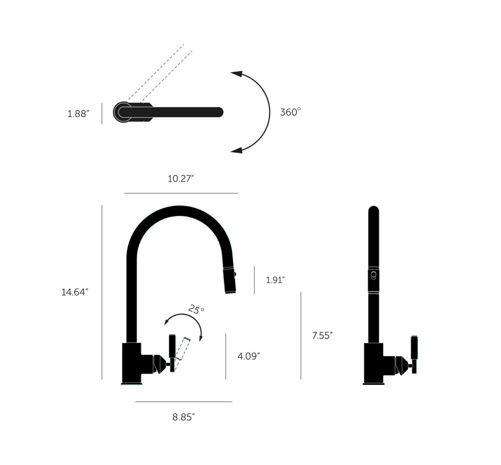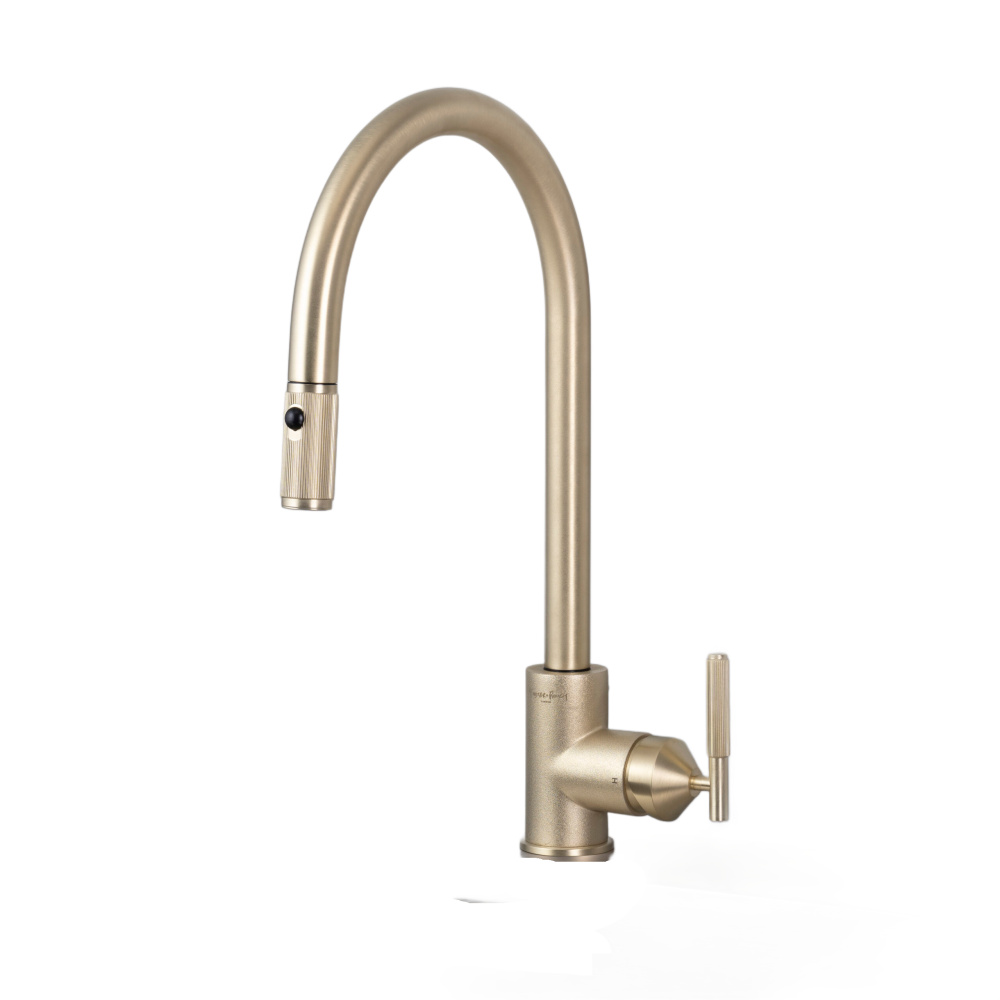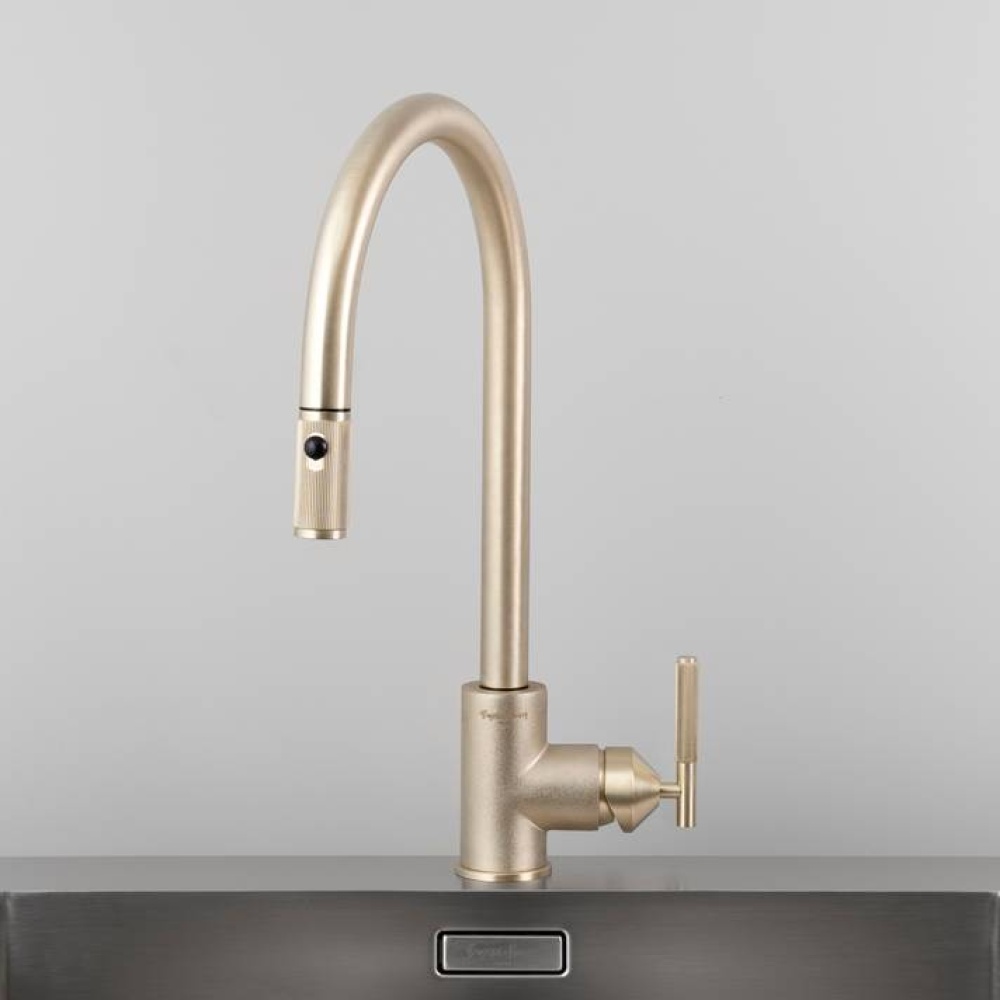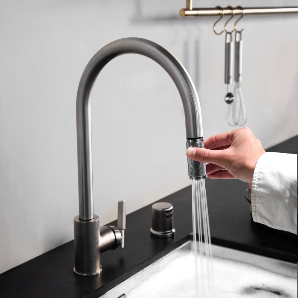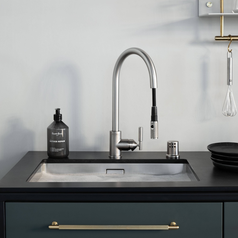 A kitchen tap with pull-out mixer, mixing warm and cold, aerated water. Built from rough-cast and precision machined solid metal in Italy, it features our signature linear-knurl lever and linear-knurled pull-out nozzle. The tap is finally refined by hand and finished with a subtle acid-etched B+P insignia.