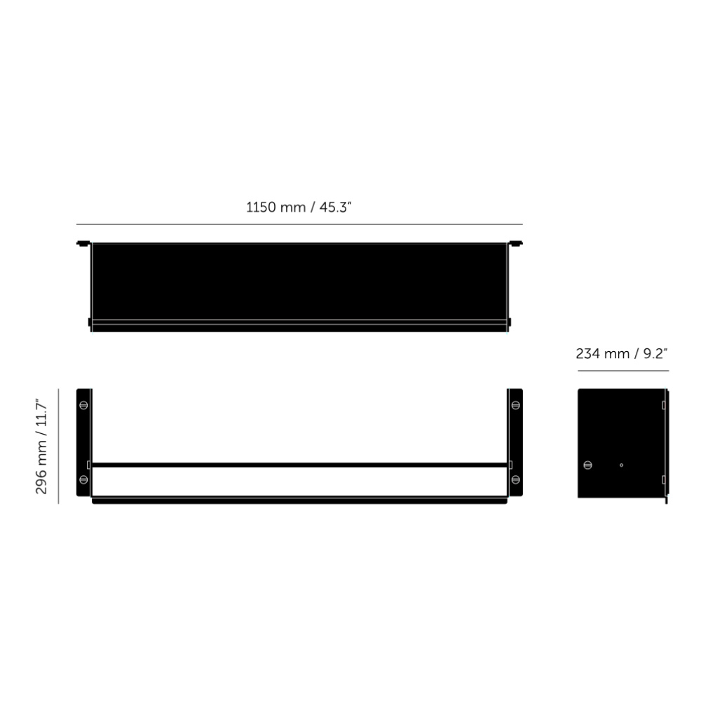 A heavy-duty shelf made from laser cut 4mm sheet aluminium, press bent into shape and powder coated. The shelf features a hand polished, 12 mm hand polished solid metal rail and is finished with matching Buster + Punch coin screws.
