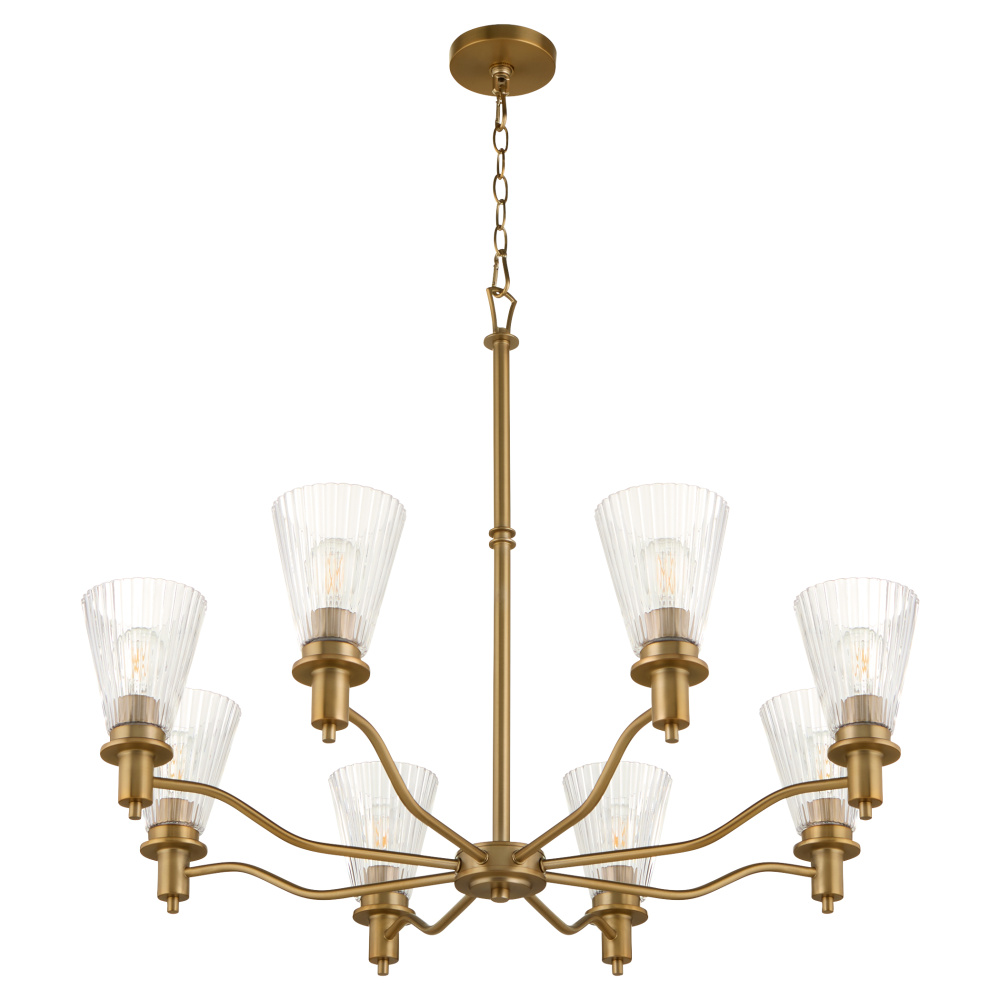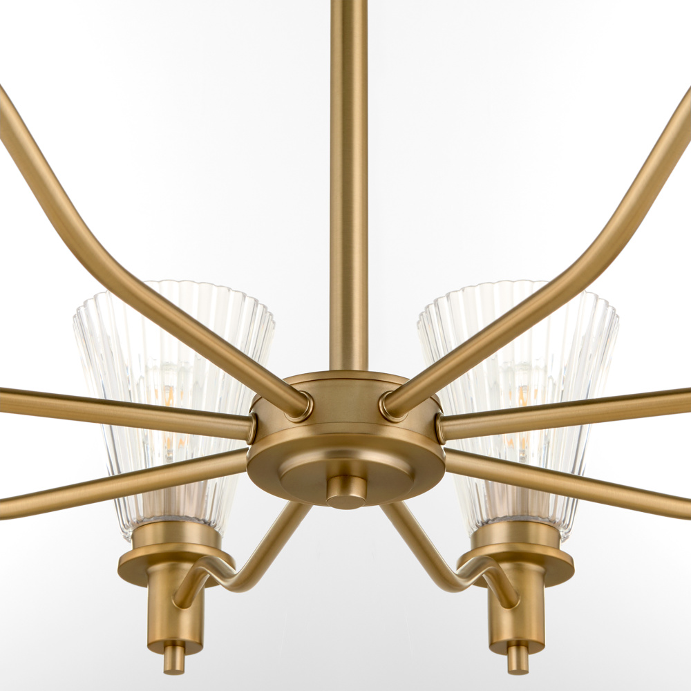 Lawton is a playful transitional series featuring pleated conical glass, ramped arms, and contemporary finishing. Early American and European styles inspired the clean bobeche, breaks, and steps in the details. Available in matte black or brushed brass, this chandelier offers versatility with 5 or 8 light options. Whether placed in living rooms, kitchens, or entryways, Lawton adds a welcoming touch to any décor.