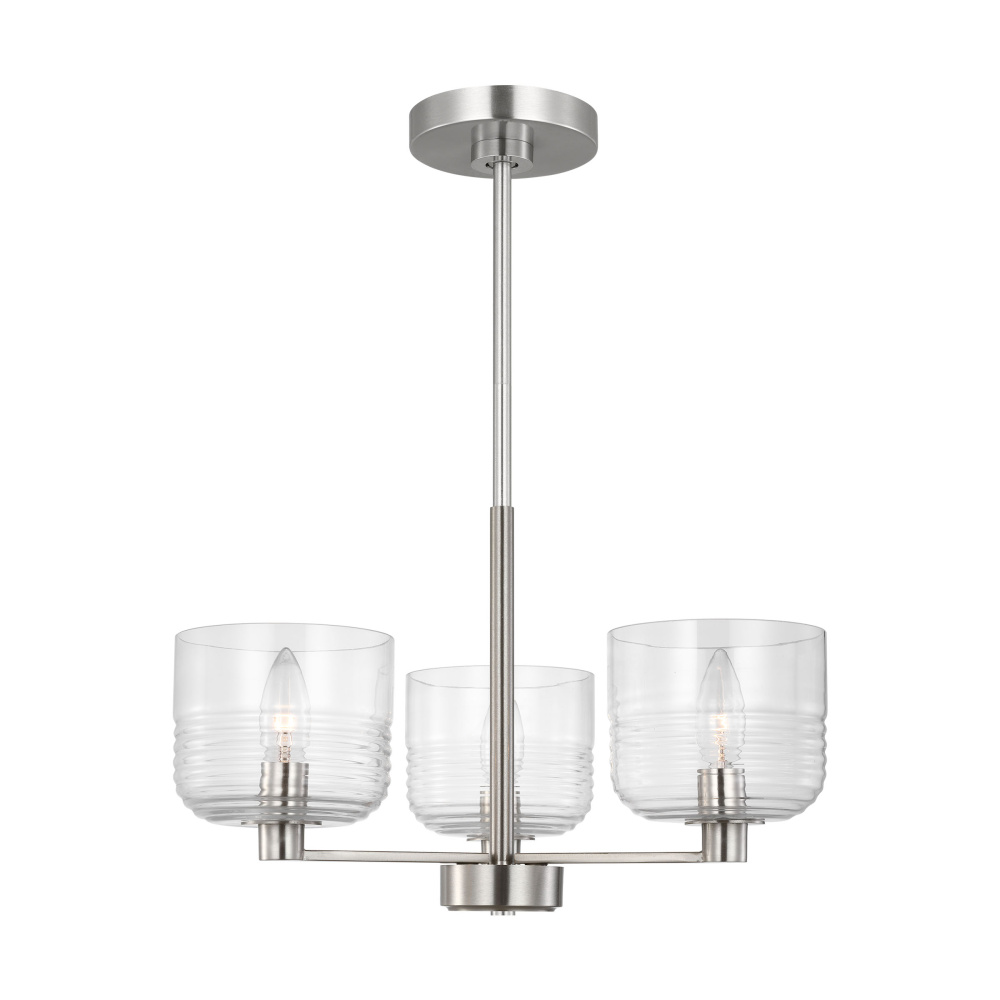 Crafted with Steel in a Brushed Nickel finish with clear ribbed glass shades