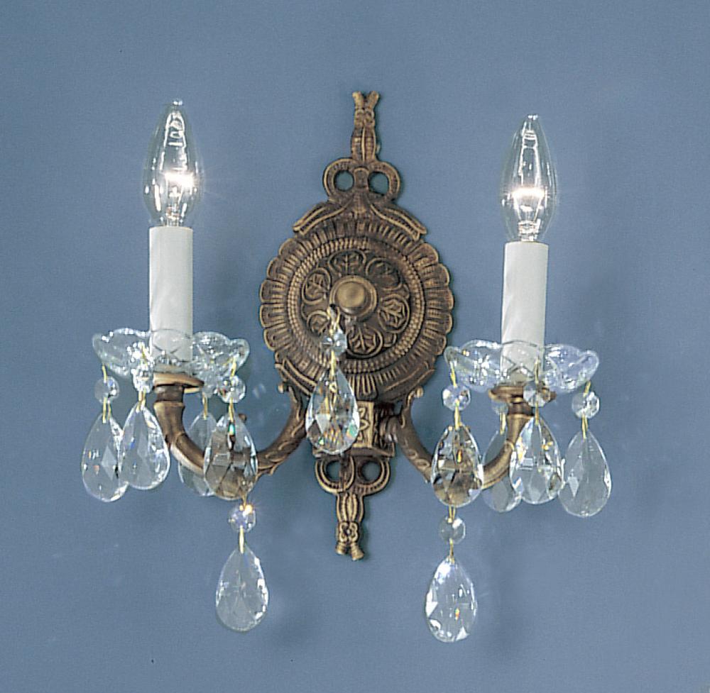 Madrid 11"Wide x 12"High x 4"Deep Lights: 2 x 60W candelabra Finish Shown: Roman Bronze Crystal Shown: Crystalique Chain or Cable Length: n/a Ship Via: Parcel Shipping Weight: 4 Hanging Weight: 3 Catalog/Page Ref: 5005/73 Cast solid brass Spanish frames are interspersed with crystal columns, founts and bobeches to give us a true classic design to adorn with a variety of crystal options - CrystaliqueTM, Swarovski Spectra Crystal and Swarovski Elements® clear crystal plus amber prisms (PAM).
