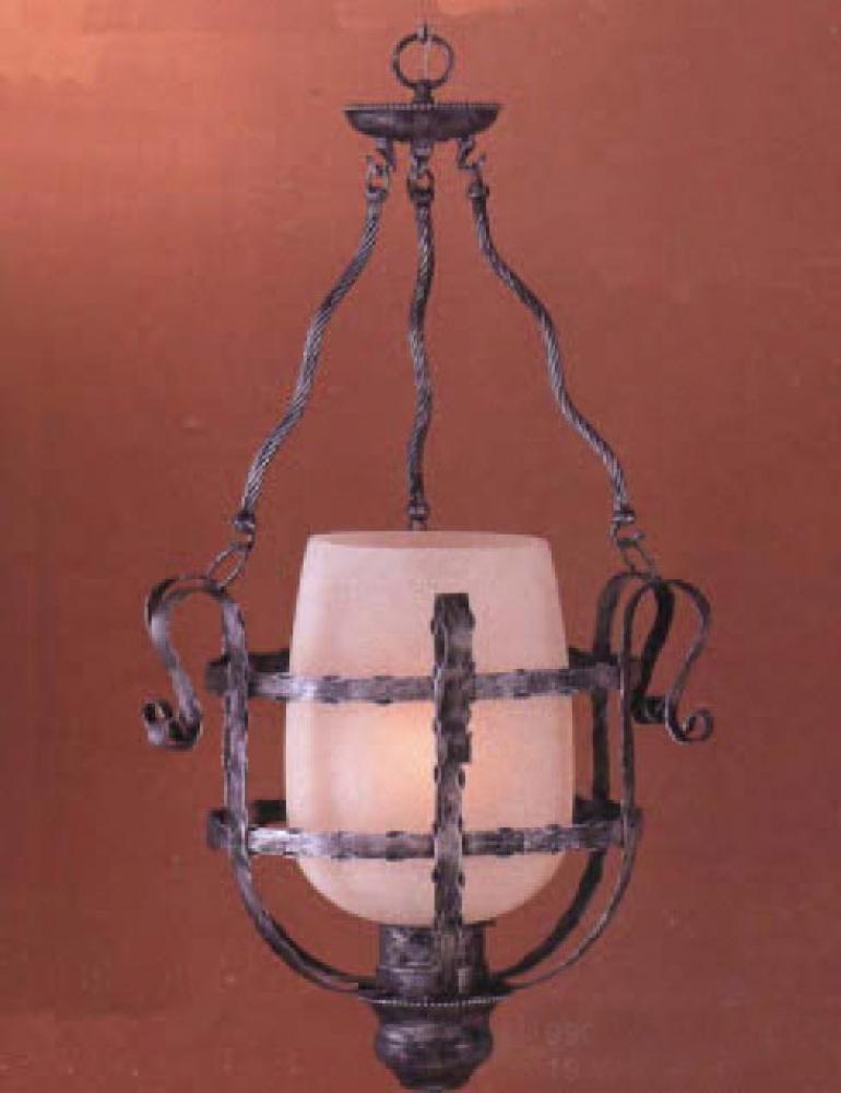 Malaga 19"Wide x 19"Long x 35"High Lights: 1 x 60W standard Finish Shown: Antique Pewter Crystal Shown: n/a Chain or Cable Length: 3 Ship Via: Parcel Shipping Weight: 15 Hanging Weight: 13 Catalog/Page Ref: 4398/59 Hammered wrought iron with scavo glass.