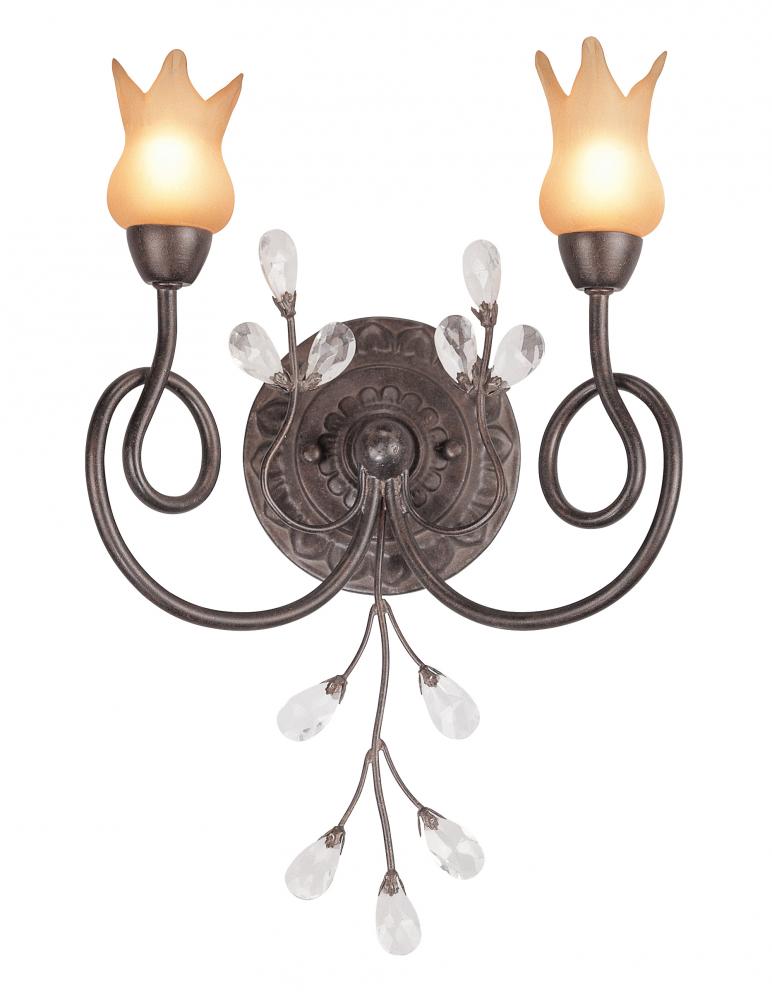 Mandarin 11"Wide x 16"High x 6"Deep Lights: 2 x 40W G9 Finish Shown: Bronze Patina Crystal Shown: Crystalique Chain or Cable Length: n/a Ship Via: Parcel Shipping Weight: 5 Hanging Weight: 3 Catalog/Page Ref: 5106/25 Delicate whimsical chandeliers and wall brackets with tulip shaped glass shades and intricate crystal laden vines are a fanciful feast for the eyes. The downlight positioning of these hand made glass shades achieves maximum efficiency from the 35 watt G-9 bulbs that are included.