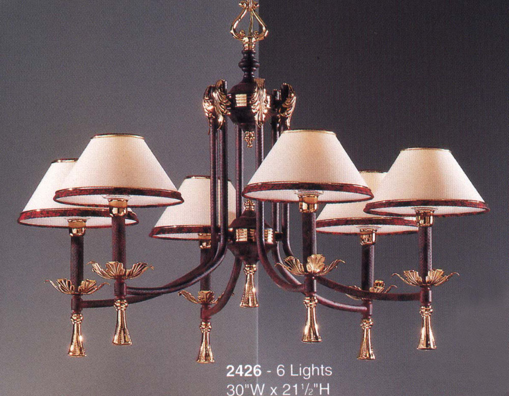 Marbella 30"Wide x 30"Long x 21.5"High Lights: 6 x 60W candelabra Finish Shown: Burnt Sienna Crystal Shown: n/a Chain or Cable Length: 3 Ship Via: Parcel Shipping Weight: 22 Hanging Weight: 18 Catalog/Page Ref: European made fixture with Burnt Sienna finish (Modeled Burgundy and Black Paint).
