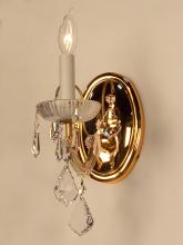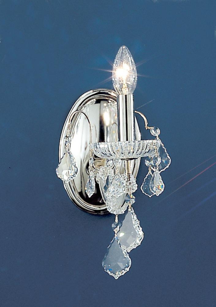 Maria Theresa 6"Wide x 12"High x 9"Deep Lights: 1 x 60W candelabra Finish Shown: Chrome Crystal Shown: Crystalique Chain or Cable Length: n/a Ship Via: Parcel Shipping Weight: 2.5 Hanging Weight: 2 Catalog/Page Ref: 5005/25 The perfect marriage between old and new ... Traditional Maria Theresa chandeliers and wall sconces trimmed with today’s highest quality Swarovski Elements, Spectra or more economical hand cut and polished Crystalique crystal produces a real look of elegance that will last for years to come. All Olde World Gold items illustrated can be ordered in Chrome (CH) finish.