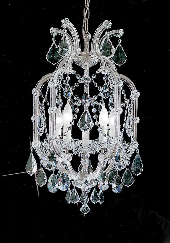 Maria Theresa 14"Wide x 14"Long x 24"High Lights: 5 x 60W candelabra Finish Shown: Chrome Crystal Shown: Crystalique Chain or Cable Length: 3 Ship Via: Parcel Shipping Weight: 20 Hanging Weight: 15 Catalog/Page Ref: 5005/32 The perfect marriage between old and new ... Traditional Maria Theresa chandeliers and wall sconces trimmed with today’s highest quality Swarovski Elements, Spectra or more economical hand cut and polished Crystalique crystal produces a real look of elegance that will last for years to come. All Olde World Gold items illustrated can be ordered in Chrome (CH) finish.