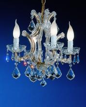 Maria Theresa 16"Wide x 16"Long x 16"High Lights: 4 x 60W candelabra Finish Shown: Chrome Crystal Shown: Crystalique Chain or Cable Length: 3 Ship Via: Parcel Shipping Weight: 10.3 Hanging Weight: 8.5 Catalog/Page Ref: 5005/32 The perfect marriage between old and new ... Traditional Maria Theresa chandeliers and wall sconces trimmed with today’s highest quality Swarovski Elements, Spectra or more economical hand cut and polished Crystalique crystal produces a real look of elegance that will last for years to come. All Olde World Gold items illustrated can be ordered in Chrome (CH) finish.