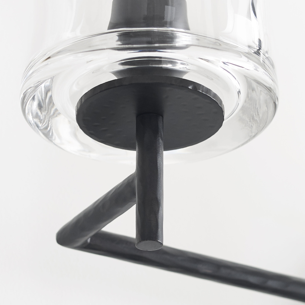 Transitional fixture with curved arms and mouth blown glass with hammered iron finish is safety listed for damp locations