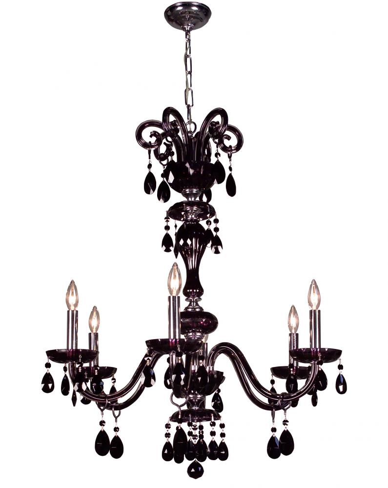 Monte Carlo 28"Wide x 28"Long x 34"High Lights: 6 x 60W candelabra Finish Shown: Black Crystal Shown: Crystalique Black Chain or Cable Length: 3 Ship Via: Parcel Shipping Weight: 26 Hanging Weight: 21 Catalog/Page Ref: 070621/6 The striking elegance and sleek lines of the Monte Carlo series will make a bold statement, whether it is used in a casino, Hotel, Grand Ballroom, or an upscale home. This rich look is achieved by combining high quality clack crystal, either Crystalique Black or flawless Swarovski Elements Jet, with lead crystal frames internally treated with a translucent black effect. Make a statement with Monte Carlo.