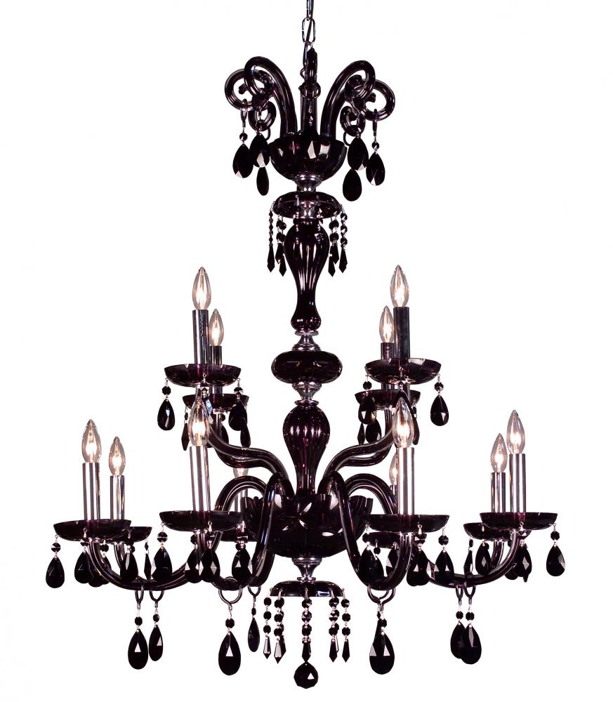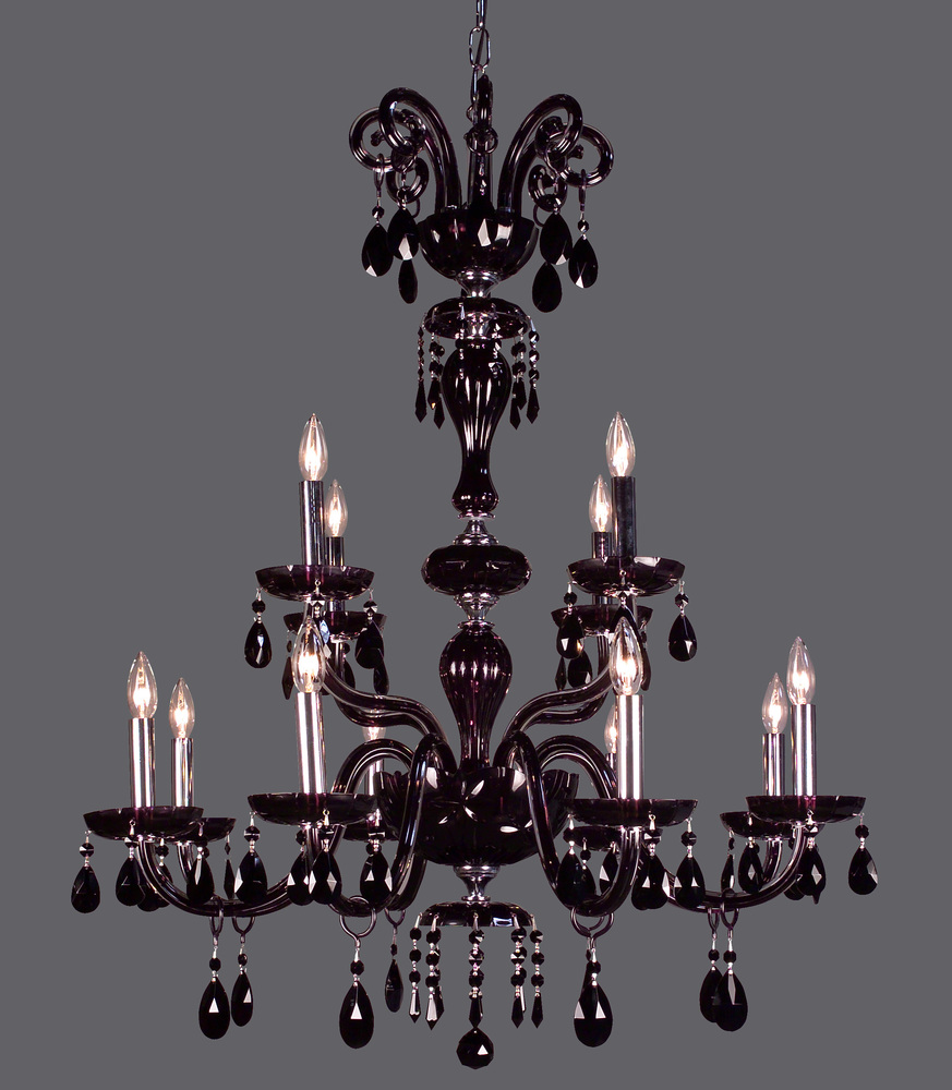 Monte Carlo 33"Wide x 33"Long x 42"High Lights: 12 x 60W candelabra Finish Shown: Black Crystal Shown: Crystalique Black Chain or Cable Length: 6 Ship Via: TRUCK Shipping Weight: 41 Hanging Weight: 35 Catalog/Page Ref: 070621/6 The striking elegance and sleek lines of the Monte Carlo series will make a bold statement, whether it is used in a casino, Hotel, Grand Ballroom, or an upscale home. This rich look is achieved by combining high quality clack crystal, either Crystalique Black or flawless Swarovski Elements Jet, with lead crystal frames internally treated with a translucent black effect. Make a statement with Monte Carlo.