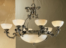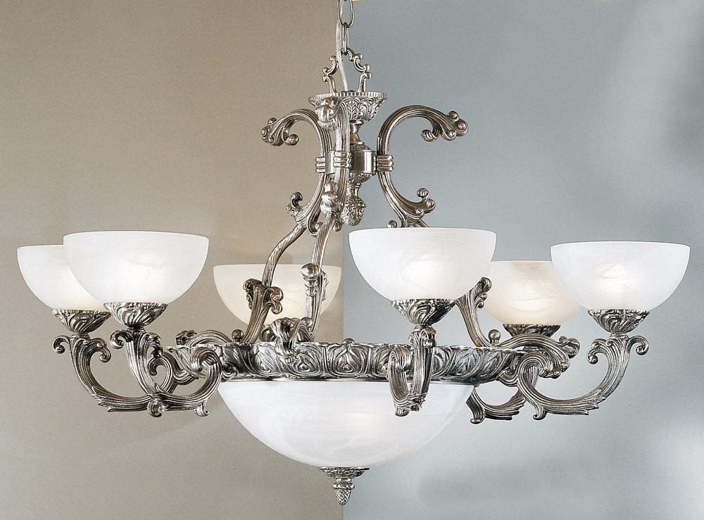 Montego Bay 35"Wide x 35"Long x 23"High Lights: 9 x 60W candelabra Finish Shown: Millennium Silver Crystal Shown: n/a Chain or Cable Length: 3 Ship Via: Parcel Shipping Weight: 50 Hanging Weight: 45 Catalog/Page Ref: 4500/175 Heavy chased cast solid brass frames are combined with faux alabaster glass for a superior value without compromising design or quality
