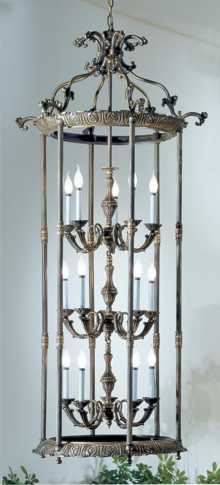 Montego Bay 33"Wide x 33"Long x 71"High Lights: 15 x 60W candelabra Finish Shown: Roman Bronze Crystal Shown: n/a Chain or Cable Length: 3 Ship Via: TRUCK Shipping Weight: Hanging Weight: 60 Catalog/Page Ref: 4601/43 Round lantern of traditional styling with a patina applied over cast brass framework.