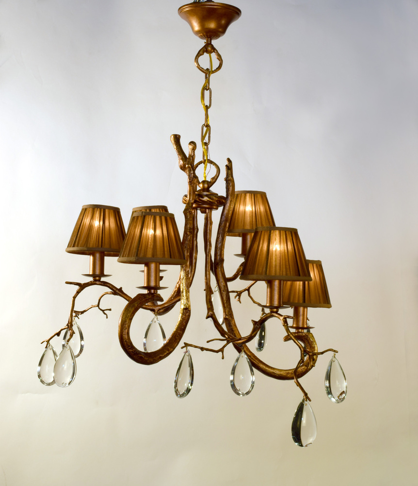 Morning Dew 24"Wide x 28"Long x 24"High Lights: 6 x 60W candelabra Finish Shown: Natural Bronze Crystal Shown: n/a Chain or Cable Length: 3 Ship Via: Parcel Shipping Weight: 35 Hanging Weight: 23 Catalog/Page Ref: 5005/149 This European made chandelier has branches that are sculpted from brass and highlighted with 24K gold leaf finish to create stunning natural bronze. It is adorned with crystal prisms and brownish/amber shades. Each of these fixtures are unique works of art, so sizes and shapes may vary slightly. In keeping with the natural form of this chandelier, it is asymetrical with all of the arms and branched being differnt sizes and extanding at different lenghts. This is sculpture as well as a functional light that will add beauty and warmth to any room. The crystal and finish can be customized on request.