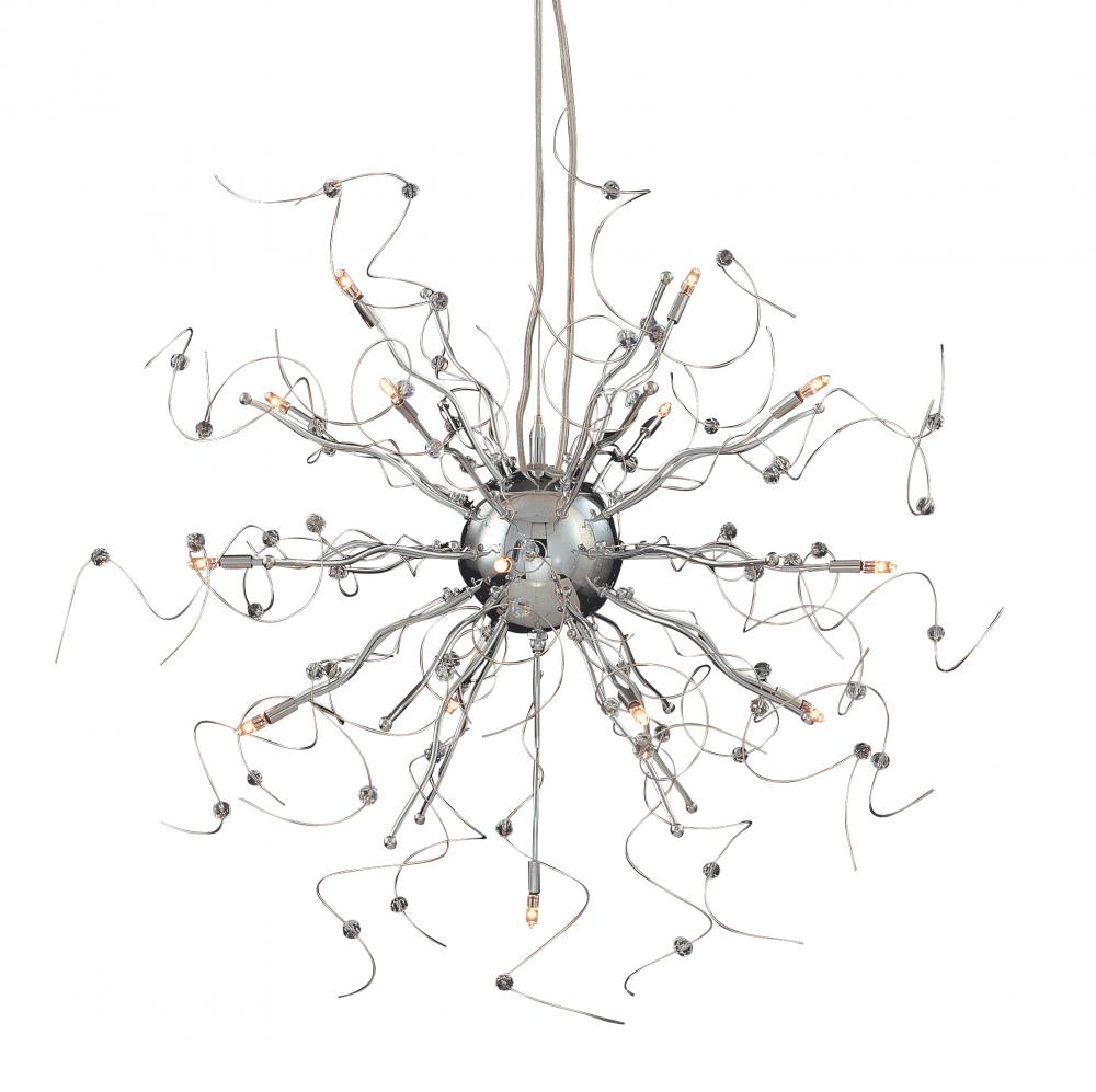 Nitro 26"Wide x 26"Long x 29"High Lights: 15 x 10W G4 Finish Shown: Chrome Crystal Shown: n/a Chain or Cable Length: 3 Ship Via: Parcel Shipping Weight: 18 Hanging Weight: 13 Catalog/Page Ref: 5410/39 Make a bold statement with this explosion of metal and lead crystal. These fixtures are small enough to be used over Islands and Bars, or shorten the wire for hallways. The design is also strong enough to use in a modern dining or living area.