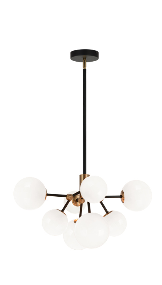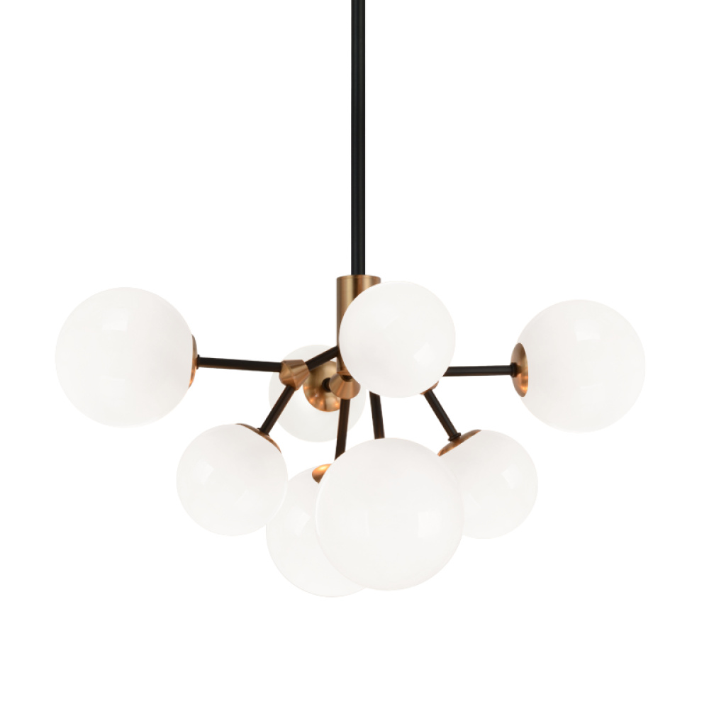 A retro inspired collection that will integrate seamlessly with many decors. Novu comes in Opal glass on sleek black rods offset with Aged Gold Brass accents. Available in a complete family including various sized ceiling fixtures, a wall sconce and a flush mount.