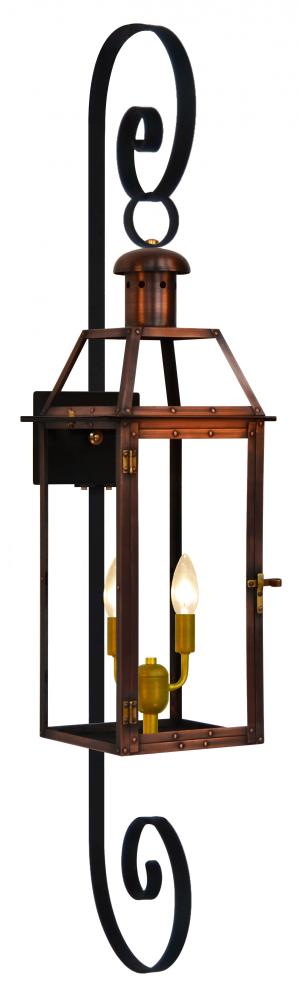 Size 25 Electric Copper Lantern, 2 candelabra base sockets, with Top Scroll, Reverse Bottom Scroll