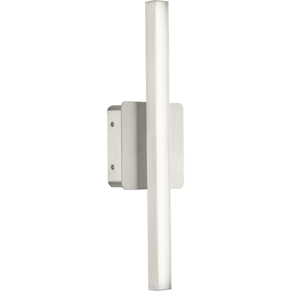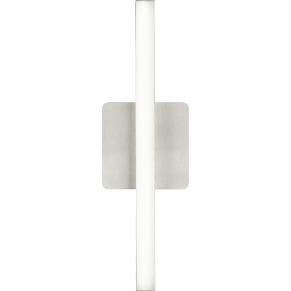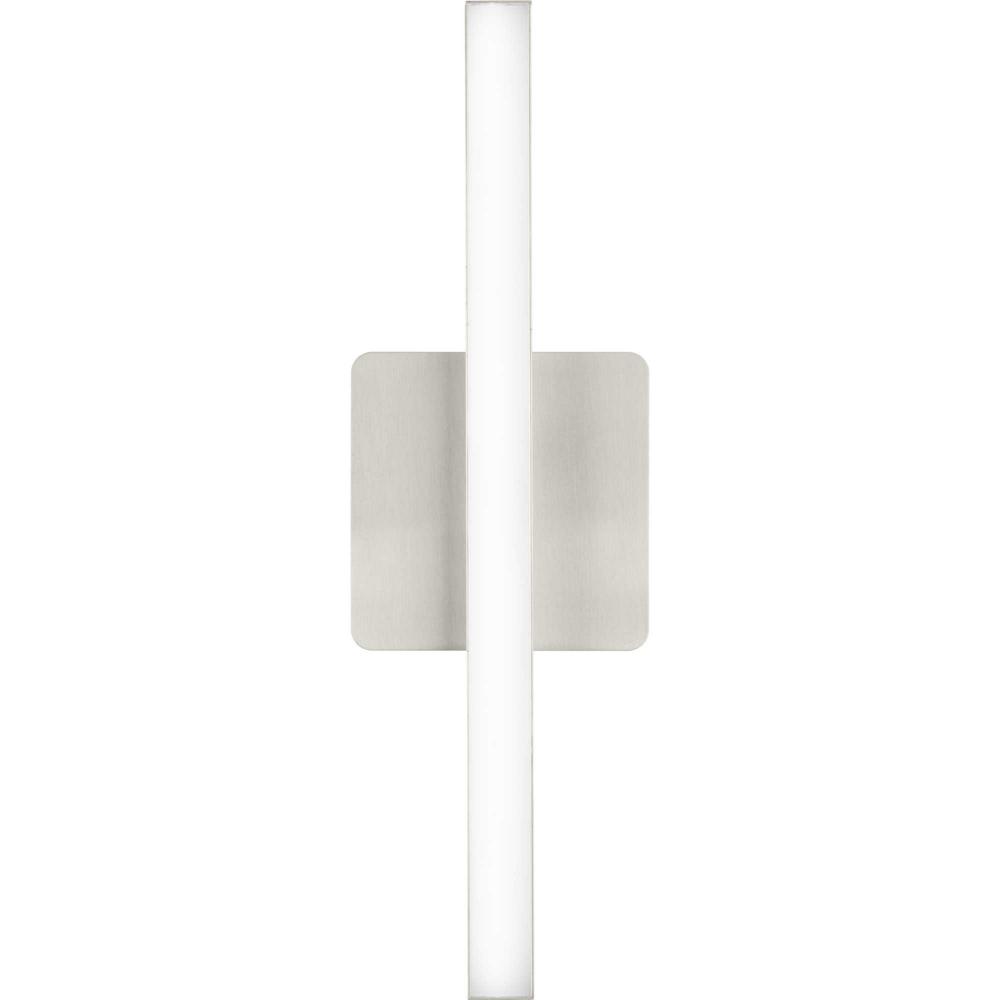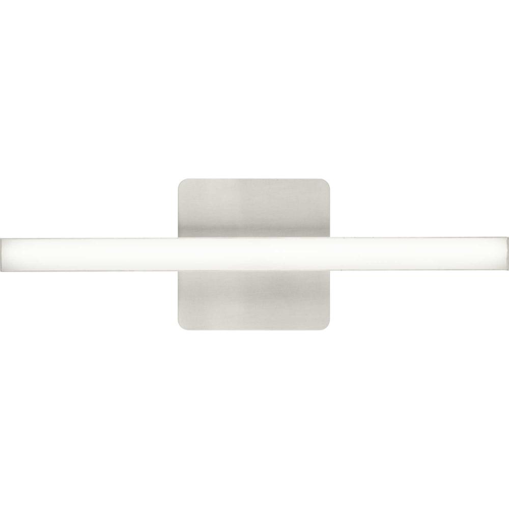The Phase 4 Collection Small LED Linear Vanity Light features color selectable technology and a sleek and minimal composition. A smooth square backplate finished in soft brushed nickel anchors the fixture, supporting a slim rectangular acrylic shade that creates a soft, uniform and energy-efficient light at 3000K, 4000K or 5000K. This versatile luminaire can be mounted as a wall sconce or as a vanity light above sinks and vanities, lending its surroundings a tailored touch. The bath light's versatile design is ideal for any bathroom in contemporary or modern commercial or residential settings. Progress Lighting products are designed for exceptional quality, reliability, and functionality.