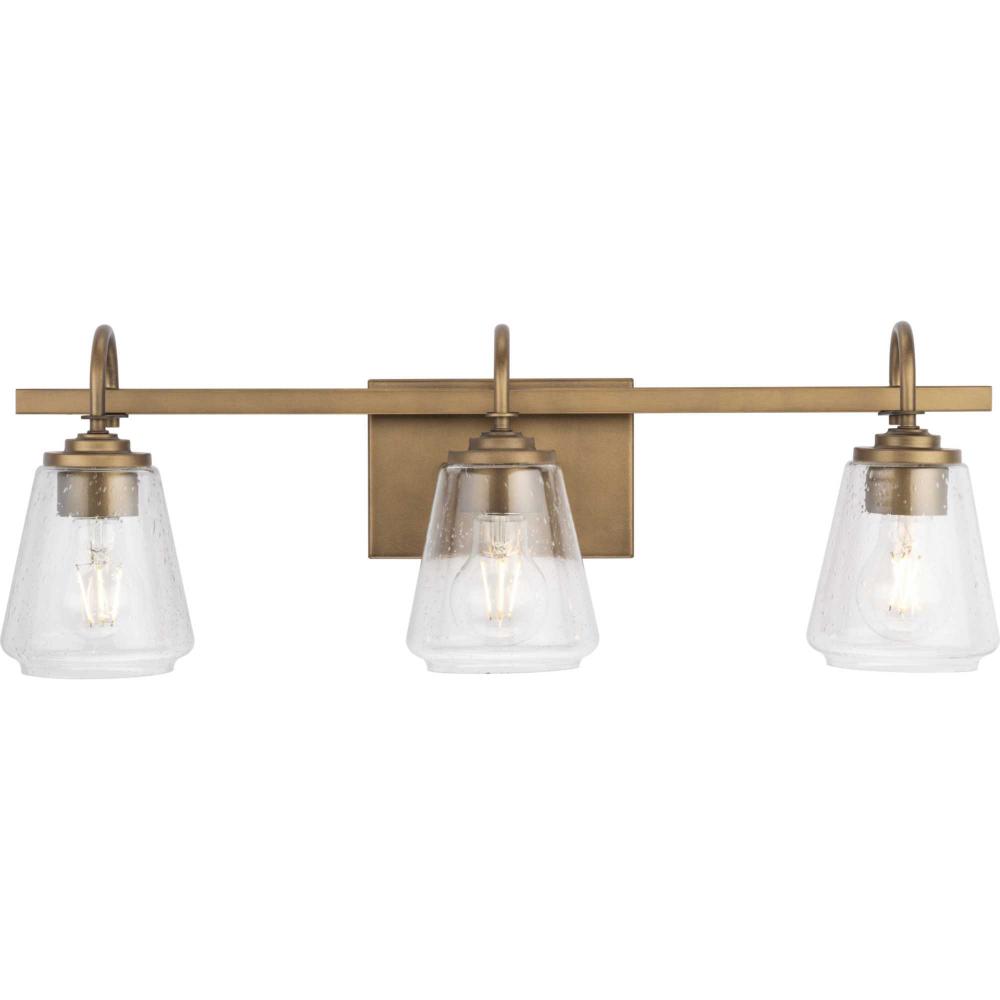 The Martenne Three-Light Vanity Light has a simple, substantial style. Seeded glass shades with an elegant flare complement the rustic modern design.Lovely illumination is cast from this versatile fixture that can be mounted up or down to fit your design intent.
