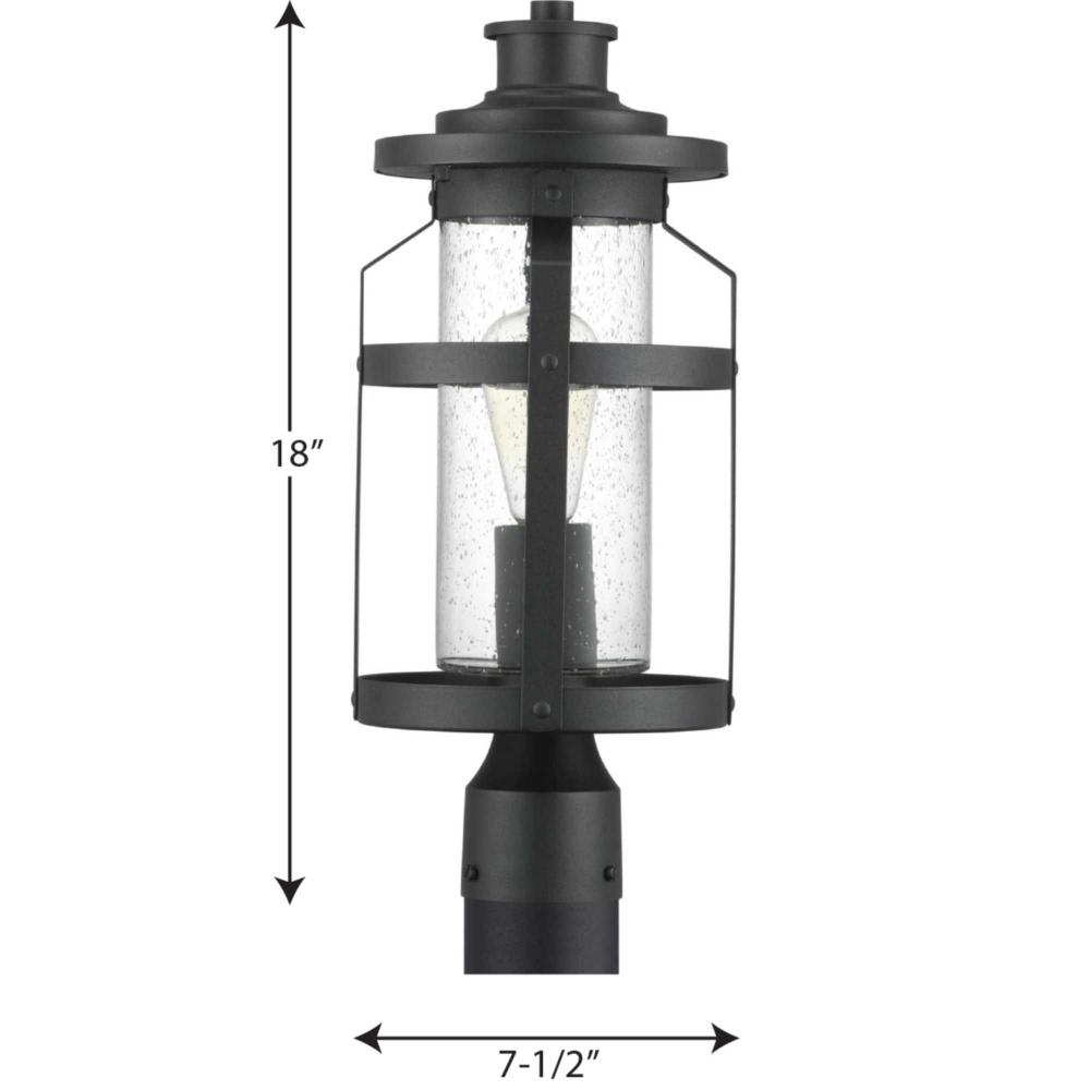 The one-light post lantern in the Haslett Collection features a design with intersecting linear details that surrounds clear seeded glass and finished in Black. Coastal-inspired frame is suitable to complement architecture with Farmhouse flair.