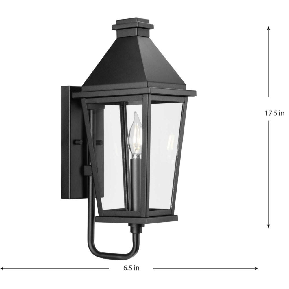 Inspired by vintage glass lanterns, the Richmond Hill Collection has a slender, tall profile and crisp angular details coated in a classic textured black finish. A stately candle enclosed within clear glass panes highlight's the elongated, tapered design while delivering crisp illumination. The updated traditional design of thiswall lantern offers fresh style to the outdoor patios, porches and other outdoor or indoor settings of modern farmhouse and transitional homes. It is cULus wet location listed for use where water may be present, with a one-year warranty to guarantee your complete satisfaction. Progress Lighting products are designed for exceptional quality, reliability, and functionality.