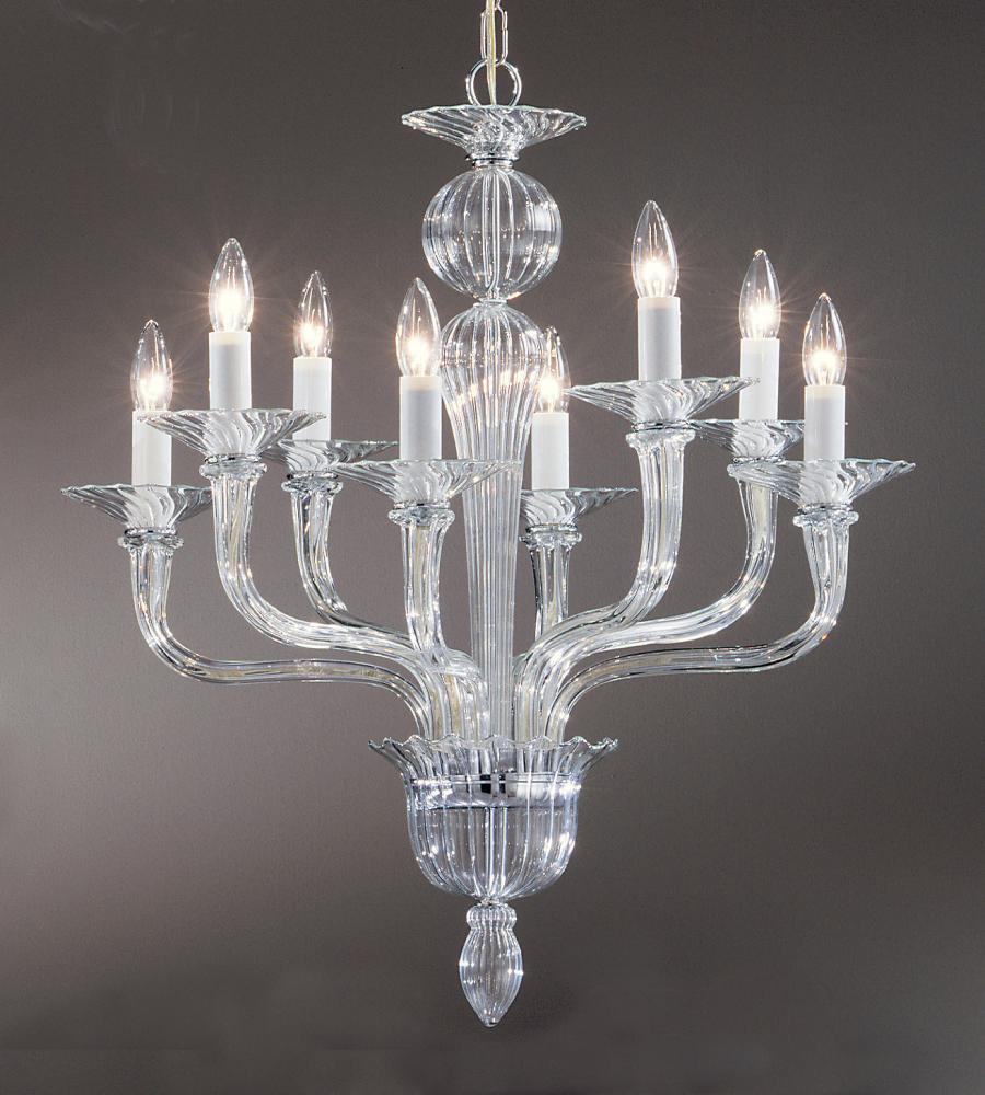 Palermo 27"Wide x 27"Long x 30"High Lights: 8 x 60W candelabra Finish Shown: Chrome Crystal Shown: n/a Chain or Cable Length: 3 Ship Via: Parcel Shipping Weight: 30 Hanging Weight: 8 Catalog/Page Ref: 5005/183 This series gives us all a different twist on the all-glass arm chandeliers. It is a contemporary approach to all-glass chandeliers. All the columns and arms are hand blown lead crystal, twisted and shaped to achieve their unique design. Very chic!