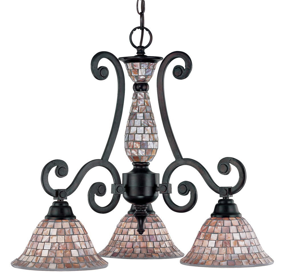 Pearl River 24"Wide x 24"Long x 20"High Lights: 3 x 60W standard Finish Shown: Oil Rubbed Bronze Crystal Shown: n/a Chain or Cable Length: 3 Ship Via: Parcel Shipping Weight: 18 Hanging Weight: 15 Catalog/Page Ref: 5308/15 A beautiful mosaic of translucent shells creates a wonderful lighting effect. Every piece is unique.