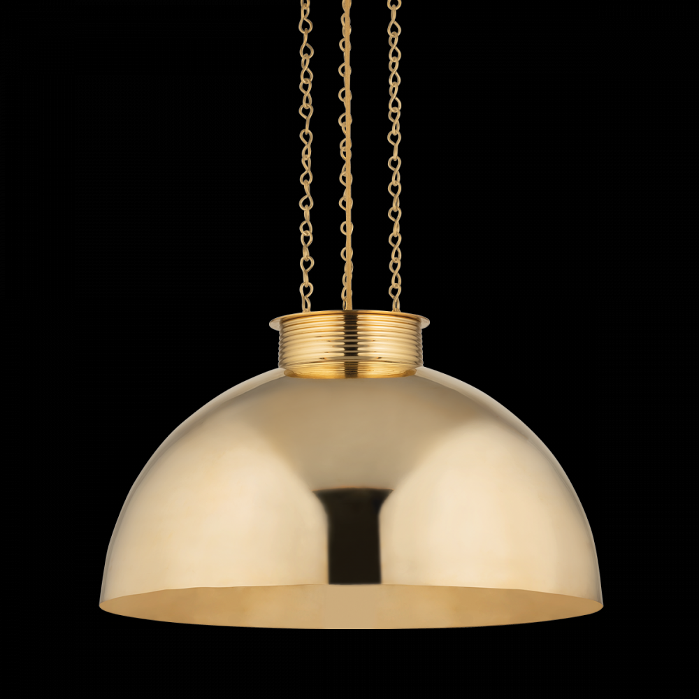 Suspended by three delicate decorative chains, this large-scale dome fixture is designed to bring refinement to everyday spaces. The allover Vintage Brass finish is refined and reflective, while the textured metal ‘bangle’ hardware gives the silhouette a jewelry-like feel. Available in two sizes, Perseus makes a bold, dynamic impression in modern spaces.
