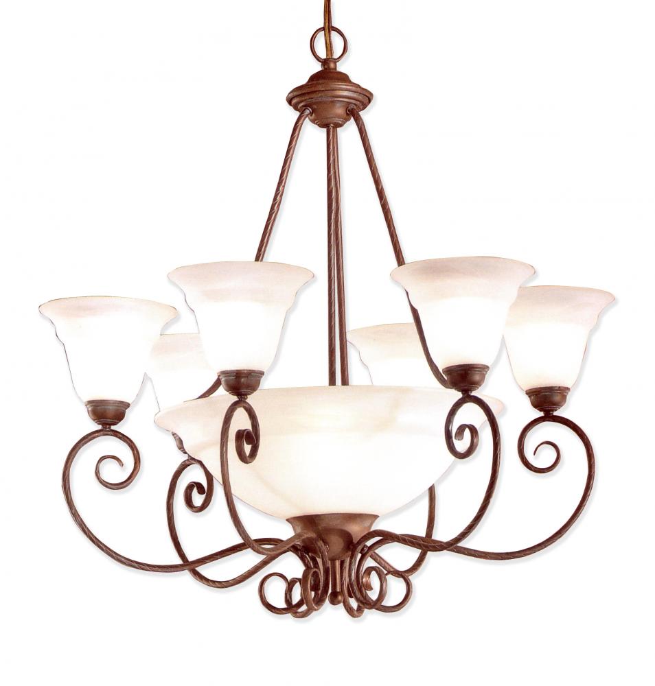 Portofino 31"Wide x 31"Long x 30"High Lights: 9 x 60W candelabra Finish Shown: Bronze Crystal Shown: n/a Chain or Cable Length: 3 Ship Via: Parcel Shipping Weight: 28 Hanging Weight: 25 Catalog/Page Ref: 4198/2 Italian made stylish empire frames combined with alabaster glass diffusers make a statement of sophistication without an expensive price tag.