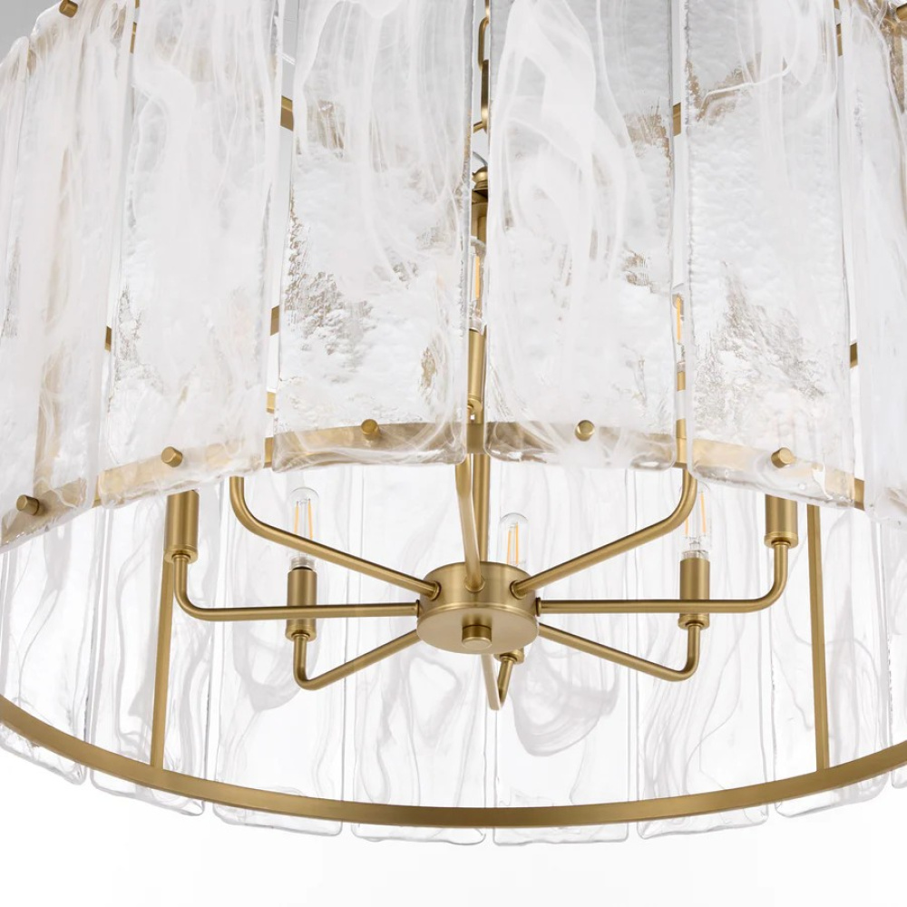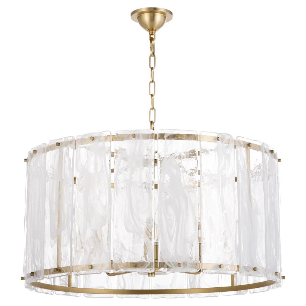 Make a statement with the Prestige series through its clear alabaster glass panels that resemble chiseled ice. Angular matte black or aged brass frames support rectangular glass panels fastened by screw details. The glacier-like diffuser conceals candelabra sockets, creating a spectacle of radiance.