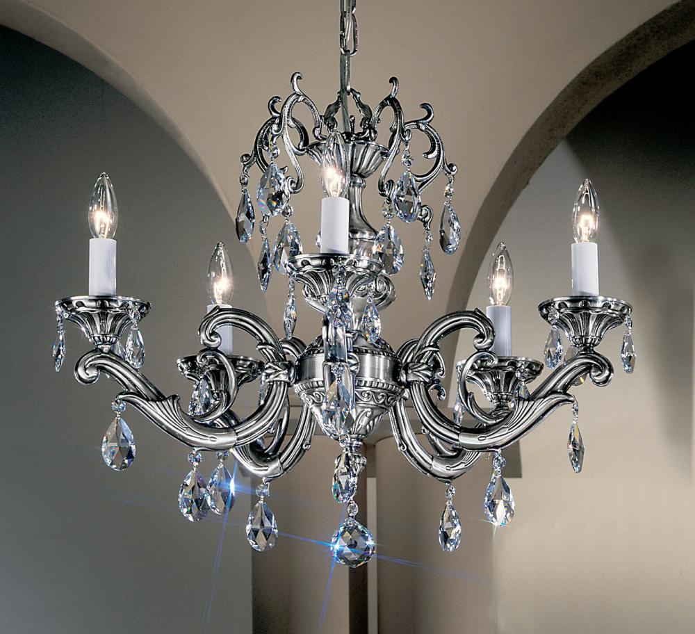 Princeton II 25"Wide x 25"Long x 18"High Lights: 5 x 60W candelabra Finish Shown: Millennium Silver Crystal Shown: Crystalique Chain or Cable Length: 3 Ship Via: Parcel Shipping Weight: 35 Hanging Weight: 25 Catalog/Page Ref: 5005/83 Borrowing designs from the late 17th Century Spanish Renaissance period when chandeliers were made of heavy bronze castings, Classic put together this Princeton II series. These bold sculptured chandeliers are excellent statement pieces for entry foyers, great rooms or formal dining rooms.