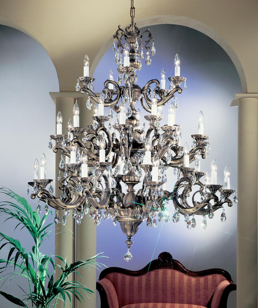 Princeton II 48"Wide x 48"Long x 54"High Lights: 40 x 60W candelabra Finish Shown: Roman Bronze Crystal Shown: Crystalique Chain or Cable Length: 6 Ship Via: TRUCK Shipping Weight: 222 Hanging Weight: 168 Catalog/Page Ref: 5005/82 Borrowing designs from the late 17th Century Spanish Renaissance period when chandeliers were made of heavy bronze castings, Classic put together this Princeton II series. These bold sculptured chandeliers are excellent statement pieces for entry foyers, great rooms or formal dining rooms.
