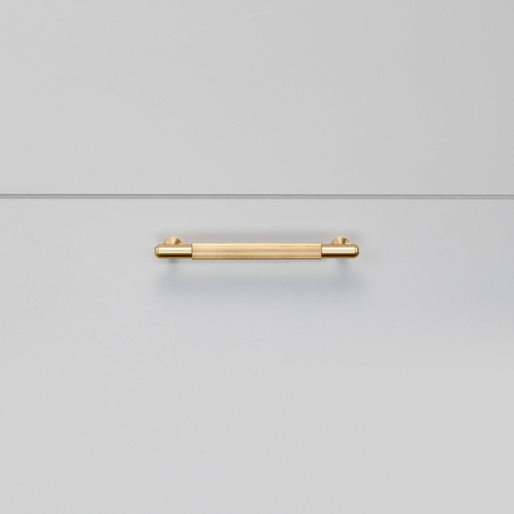 A pull bar made from solid brass. This pull bar features our signature, diamond-cut, linear-knurl pattern and is refined by hand. They work great on cabinet doors, wardrobe drawers, cupboards, kitchen units and just about anything that can open.