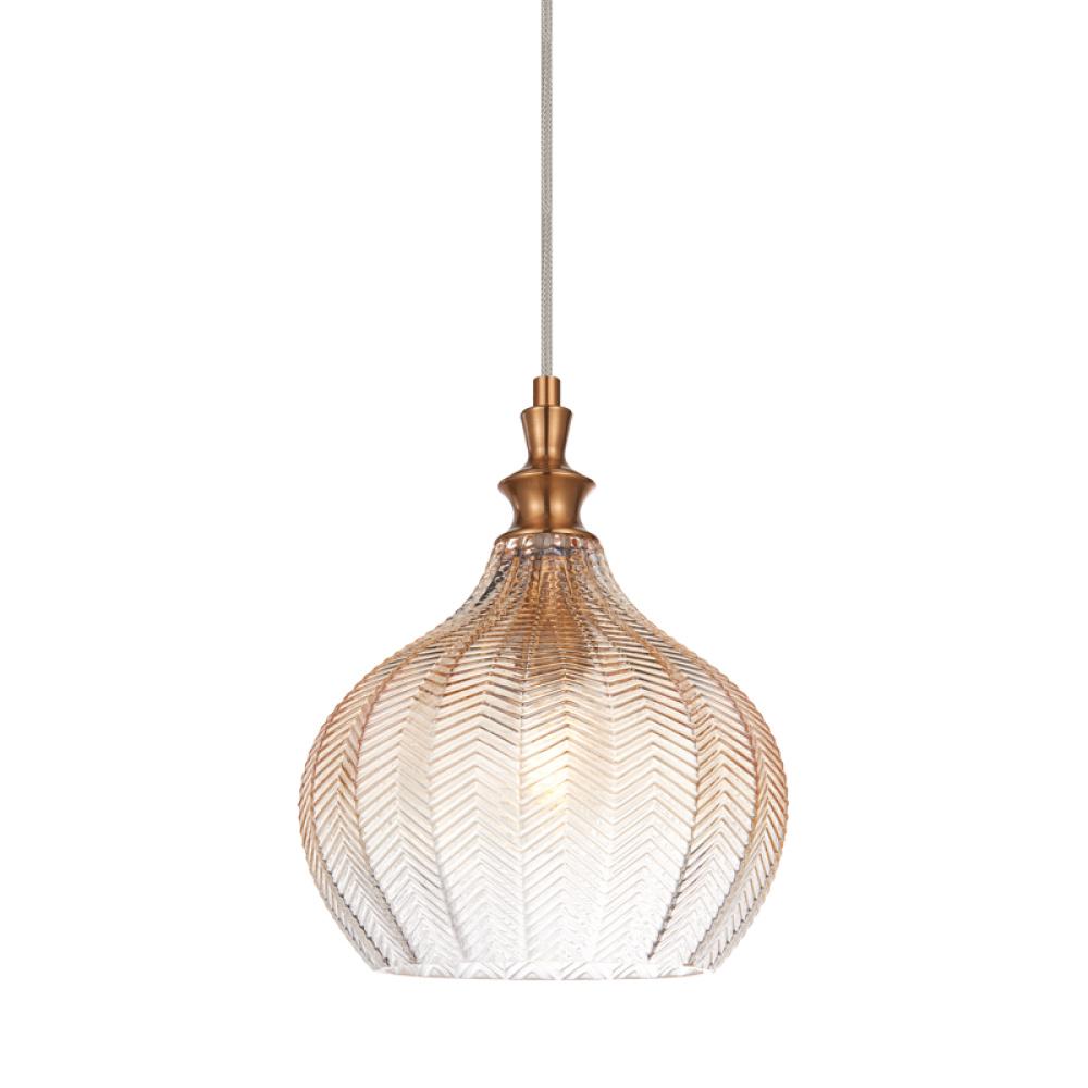 The Renity series features an elegant design of chevron textured glass, matched with either Aged Gold Brass or Smoke finish.These sophisticated pendants will add charm to any space. Available in 2 glass shapes.