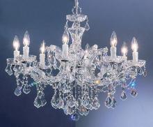 This version remains true to the original traditional Maria Theresa design and crystal trim. It is a better complement to the more conventional decorating schemes. It is trimmed with Crystalique- Plus™ as the standard trim. In the Maria Theresa tradition, the metal frames are encased with blow glass panels and glass dishes.