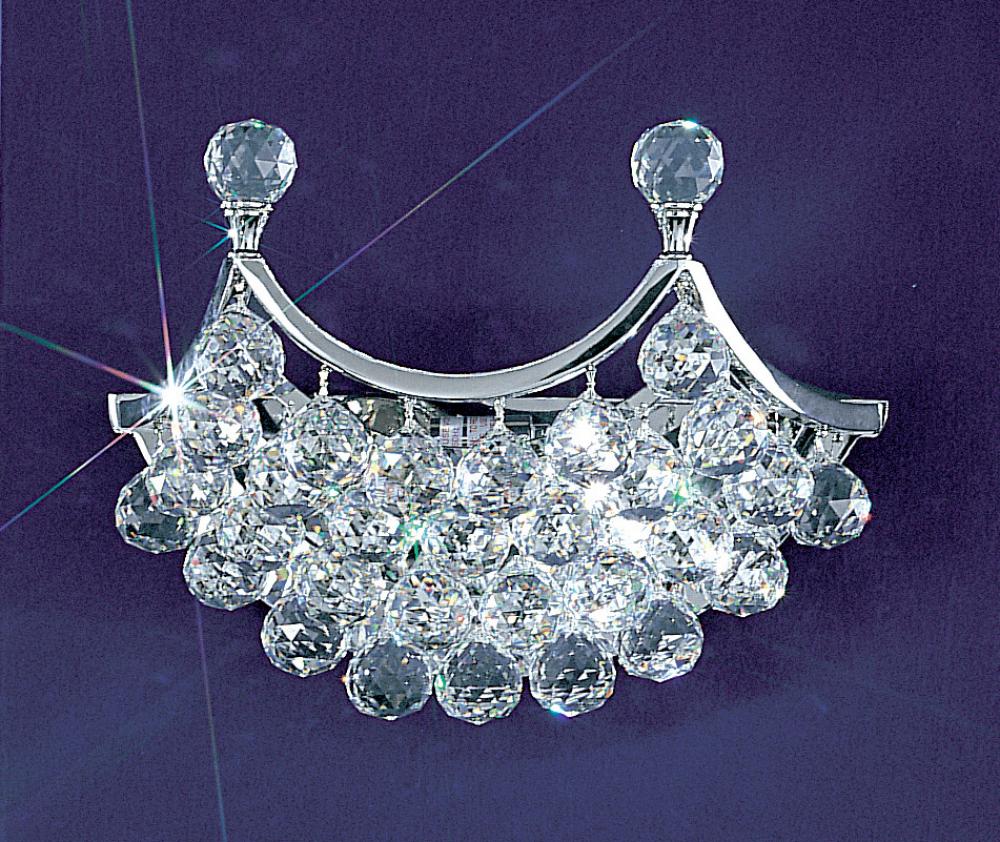 Solitaire 14"Wide x 10"High x 7"Deep Lights: 2 x 60W candelabra Finish Shown: Chrome Crystal Shown: Crystalique-Plus Chain or Cable Length: n/a Ship Via: Parcel Shipping Weight: 4 Hanging Weight: 10 Catalog/Page Ref: 5005/129 This series offers jewel-like styling. Solid brass frames are finished in mirror-like chrome and lavished with lead crystal spheres. The tight weave of the design closes the bottom so as to hide the inside lights. These cut balls are offered in three crystal qualities. Fixtures are also dual mount. May be hung by chain or flush.