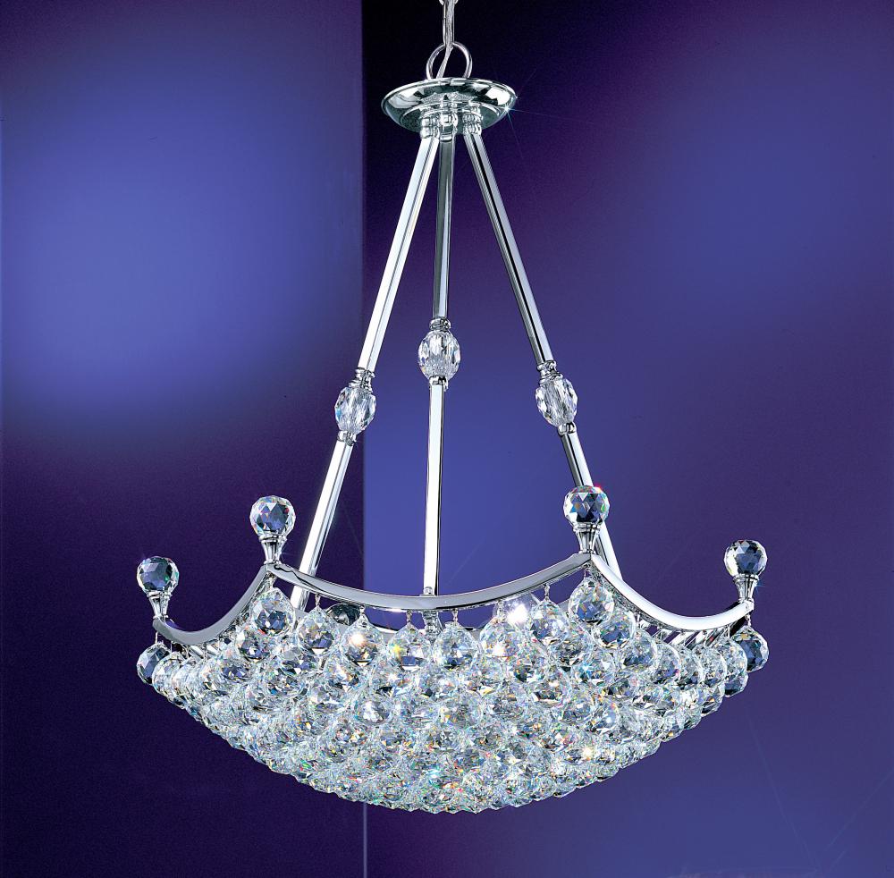 Solitaire 23"Wide x 23"Long x 24"High Lights: 15 x 60W candelabra Finish Shown: Chrome Crystal Shown: Crystalique-Plus Chain or Cable Length: 3 Ship Via: Parcel Shipping Weight: 59 Hanging Weight: 55 Catalog/Page Ref: 5005/130 This series offers jewel-like styling. Solid brass frames are finished in mirror-like chrome and lavished with lead crystal spheres. The tight weave of the design closes the bottom so as to hide the inside lights. These cut balls are offered in three crystal qualities. Fixtures are also dual mount. May be hung by chain or flush.