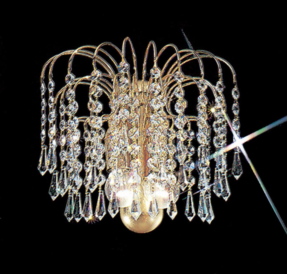 Spray Wall Bracket 11"Wide x 9"High x 5"Deep Lights: 2 x 60W candelabra Finish Shown: 24k Gold Plate Crystal Shown: Crystalique-Plus Chain or Cable Length: n/a Ship Via: Parcel Shipping Weight: 5 Hanging Weight: 4 Catalog/Page Ref: 5005/131 24k gold plated sprays lavishly trimmed with showers of shimmering crystal jewels and spears.