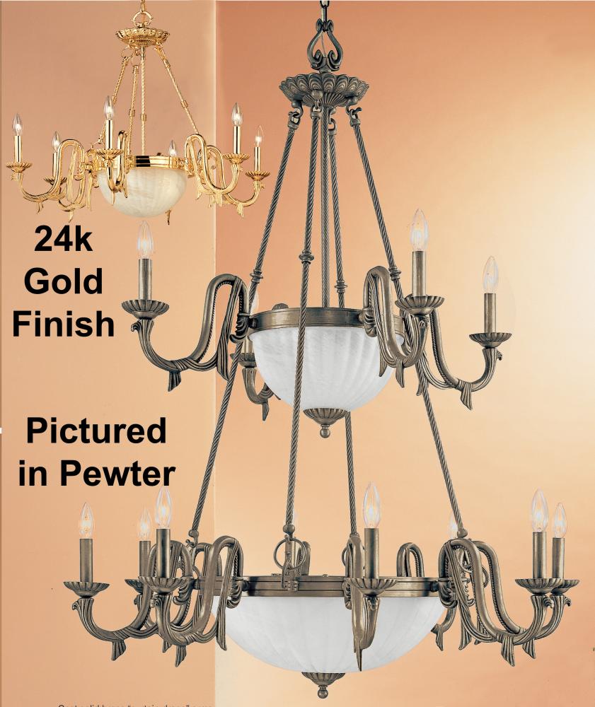 St. Moritz 40"Wide x 40"Long x 47"High x 81"Deep Lights: 17 x 60W candelabra Finish Shown: Gold Crystal Shown: n/a Chain or Cable Length: n/a Ship Via: TRUCK Shipping Weight: 81 Hanging Weight: 70 Catalog/Page Ref: 4500/137 Cast solid brass frames with white cloud glass.